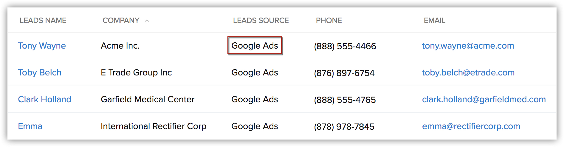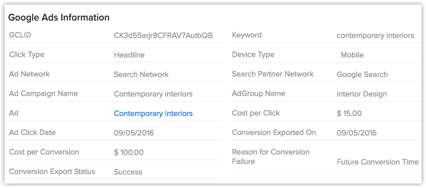 Google 広告で獲得した見込み客/連絡先のデータ :訪問者が見込み客/連絡先のWebフォームに詳細を入力すると、入力内容がZoho CRMに送信されます。入力内容をもとに新しい見込み客/連絡先データが作成され、GCLIDが関連付けられます。また、Zoho CRMでデータが作成されてから48~72時間後に、見込み客/連絡先データの詳細ページに、Google 広告の詳細に関する情報が表示されるようになります。