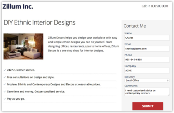 訪問者が広告をクリックして 表示されるページの内容を読み、Webフォームに入力します。この時点で、GCLIDが作成され、ページのURLに追加されます。このGCLIDを通じて、Google 広告のデータとZoho CRMのデータが関連付けられます。