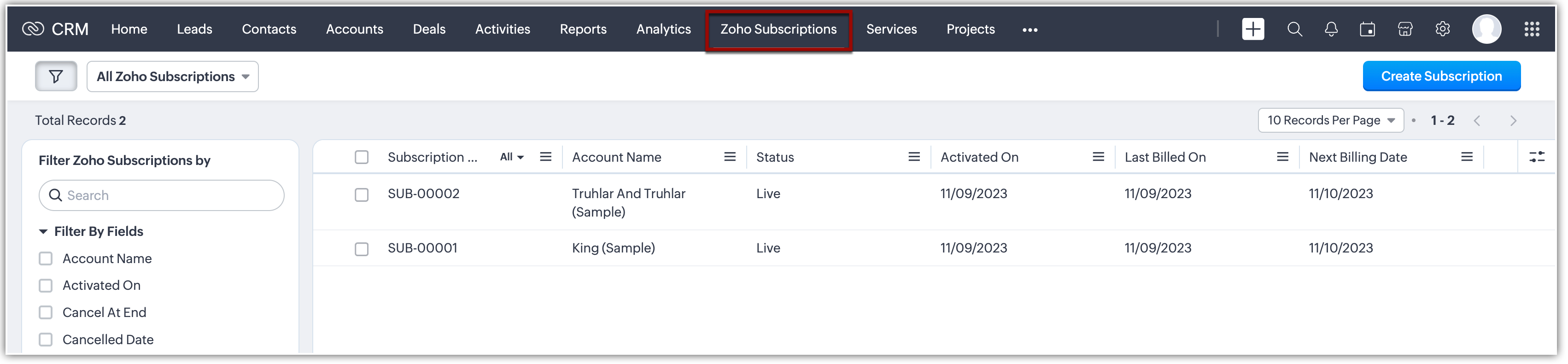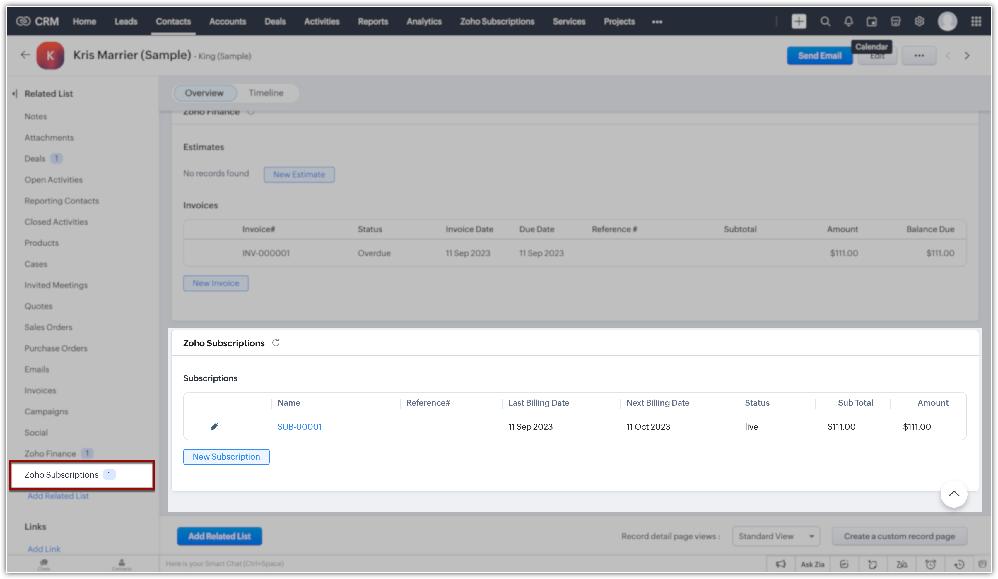 - また、Zoho CRMのデータの詳細ページには、Zoho Subscriptionsの関連リストが追加されます。