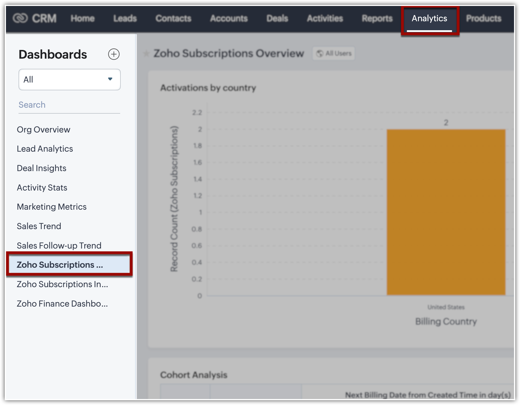 Zoho Subscriptionsのダッシュボードには、[Zoho Subscriptionsの概要]と[Zoho Subscriptionsの指標データ]の2種類があります。各ダッシュボードにアクセスするには、Zoho CRMで[アナリティクス]タブに移動し、画面左側のメニューで表示するダッシュボードを選択します。