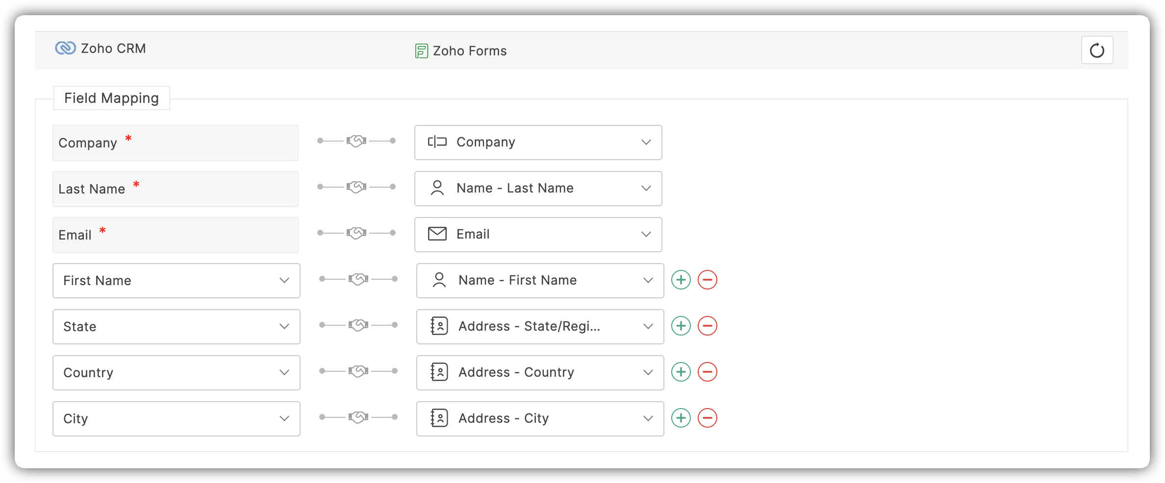 項目の関連付け:Zoho CRMの項目をZoho Formsのフォームの項目と関連付けることができます。たとえば、Zoho Formsで作成したフォームに会社名の項目を追加したとします。