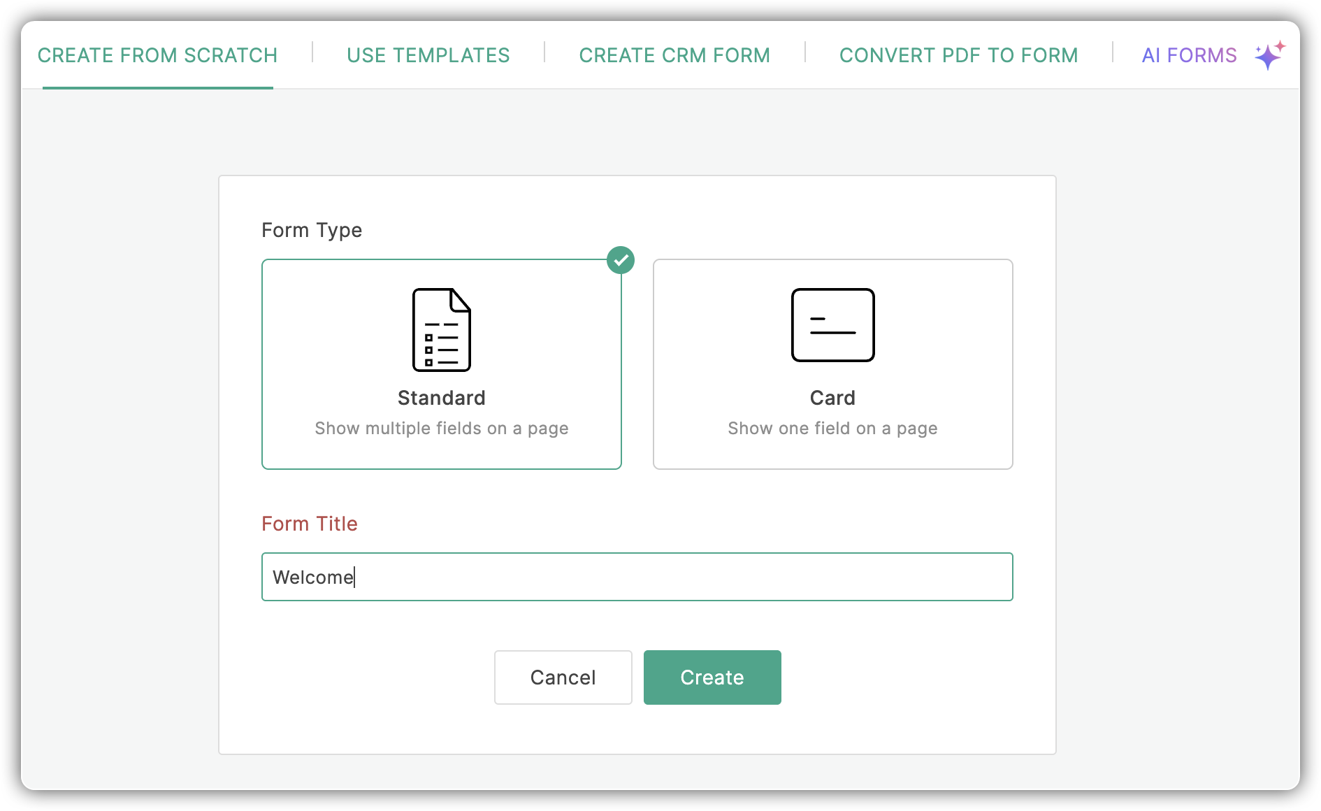 Zoho Formsでは、新しいフォームをはじめから作成することも、テンプレートからフォームを作成することもできます。