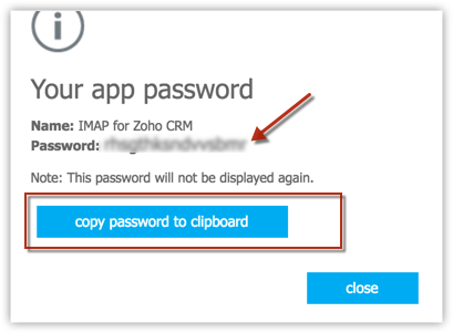 - 生成されたアプリ専用パスワードをコピーして、Zoho CRMのIMAP設定の[パスワード]欄に貼り付けて入力します。該当のアプリ(メールアカウント)を使用しなくなった場合や、アプリに対して付与したアクセス権を削除する場合は、パスワードを無効にできます。