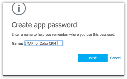 - 識別しやすい名前を入力します(例: Zoho CRM用IMAP)。