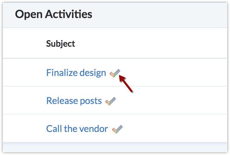 [Zoho Projectsに同期する]のチェックボックスを選択した場合、追加したタスクのステータスや詳細の更新がZoho CRMとZoho Projects間で同期されます。選択しない場合は、作成したタスクはZoho Projectsに追加されますが、以降のステータスや詳細は同期されません。同期を有効にしたタスクには、[未完了の活動]の関連リストでタスク名の右横にZoho Projectsのアイコン(チェックマーク形)が表示されるため、識別可能です。
