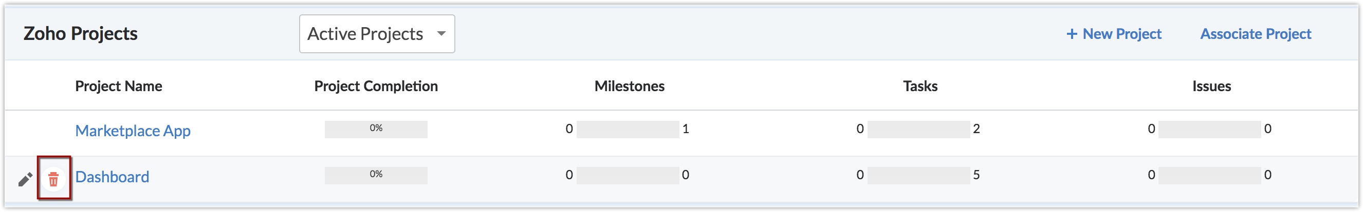 関連付けられているプロジェクトの一覧には、プロジェクト名、プロジェクトのステータス、プロジェクトの完了度、マイルストーンの完了度、タスクの完了度、課題の完了度などの詳細が表示されます。 - 対象のプロジェクトにカーソルを合わせ、表示されたごみ箱(削除する)アイコンをクリックします。
