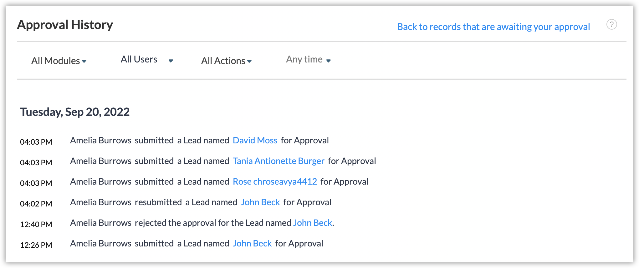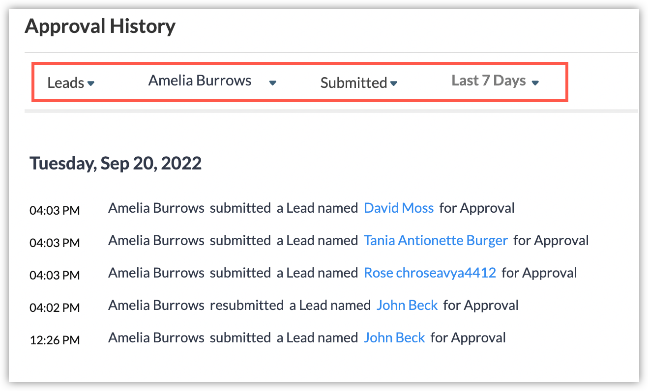 たとえば、[見込み客]タブの特定のユーザーが、過去7日間に承認のために送信した、すべてのデータを表示する場合