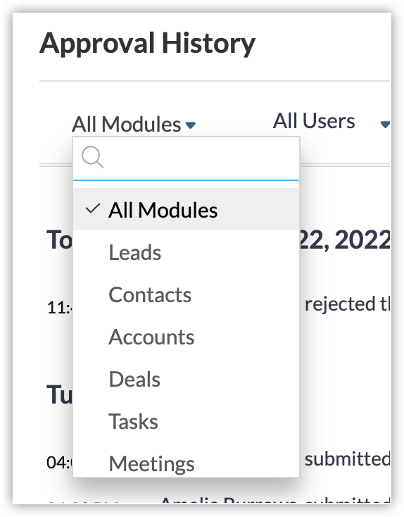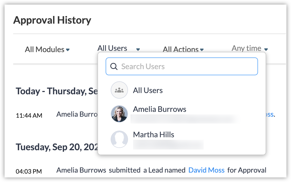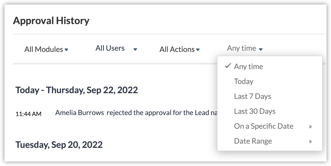 時間の経過とともに[承認の履歴]は膨大になるため、いくつかの特定の詳細情報を探している場合は、データの選別が大変です。たとえば、特定のユーザーが承認を得るために送信したデータのみを表示したり、過去7日間に承認のために送信されたデータの一覧を表示したりする場合、膨大な一覧から該当するデータを見つけることは困難です。このような場合、提供されているフィルターオプションを使用して、目的のデータを絞り込むことができます。