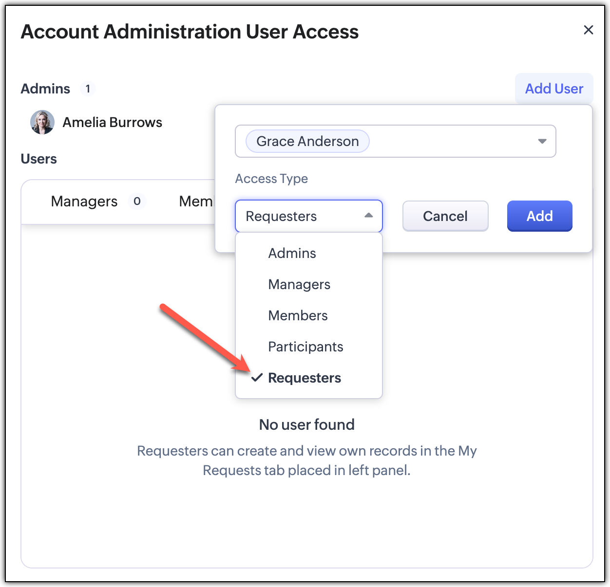 - 選択したユーザーのアクセス権限として[申請者]を選択し、[追加する]をクリックします。