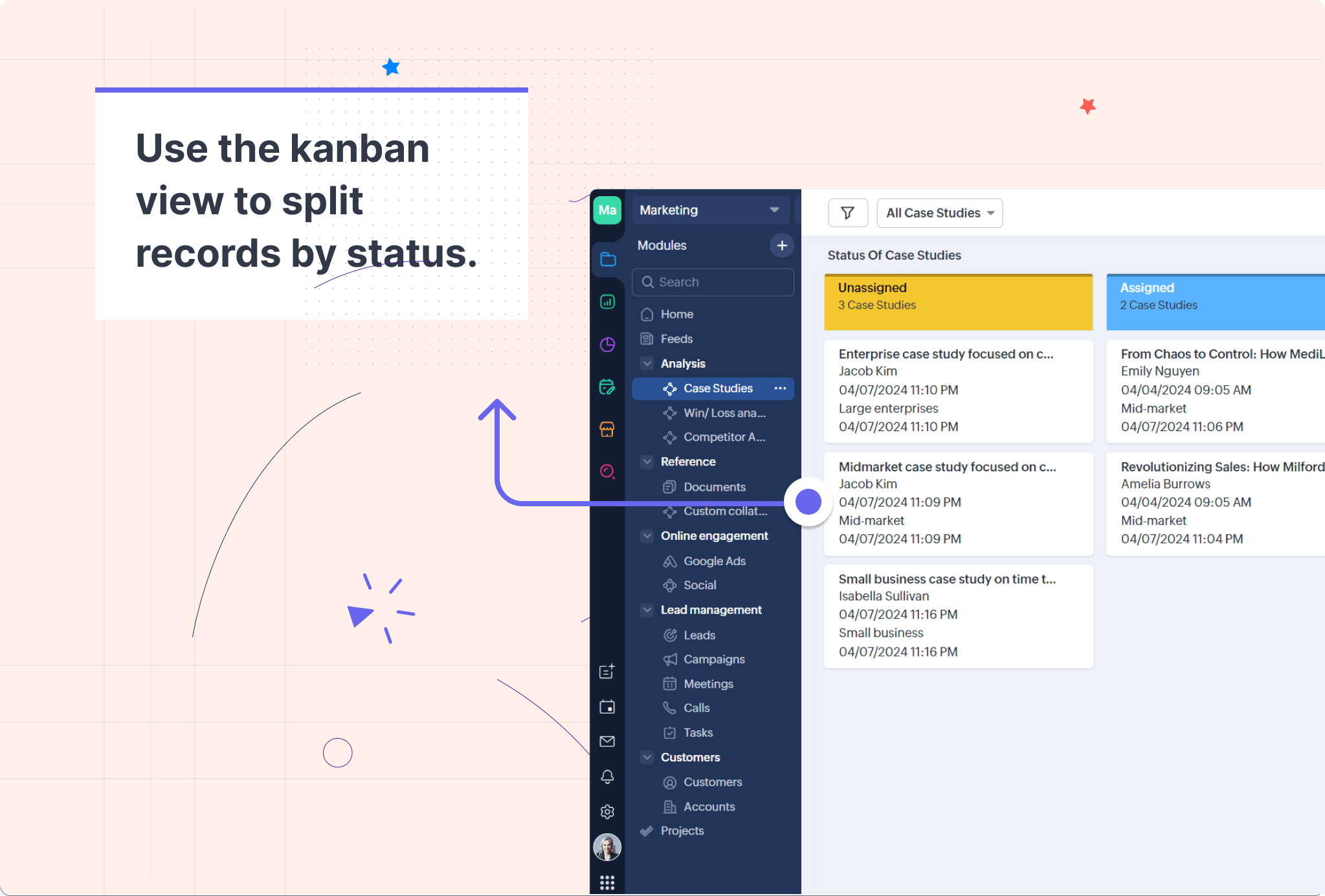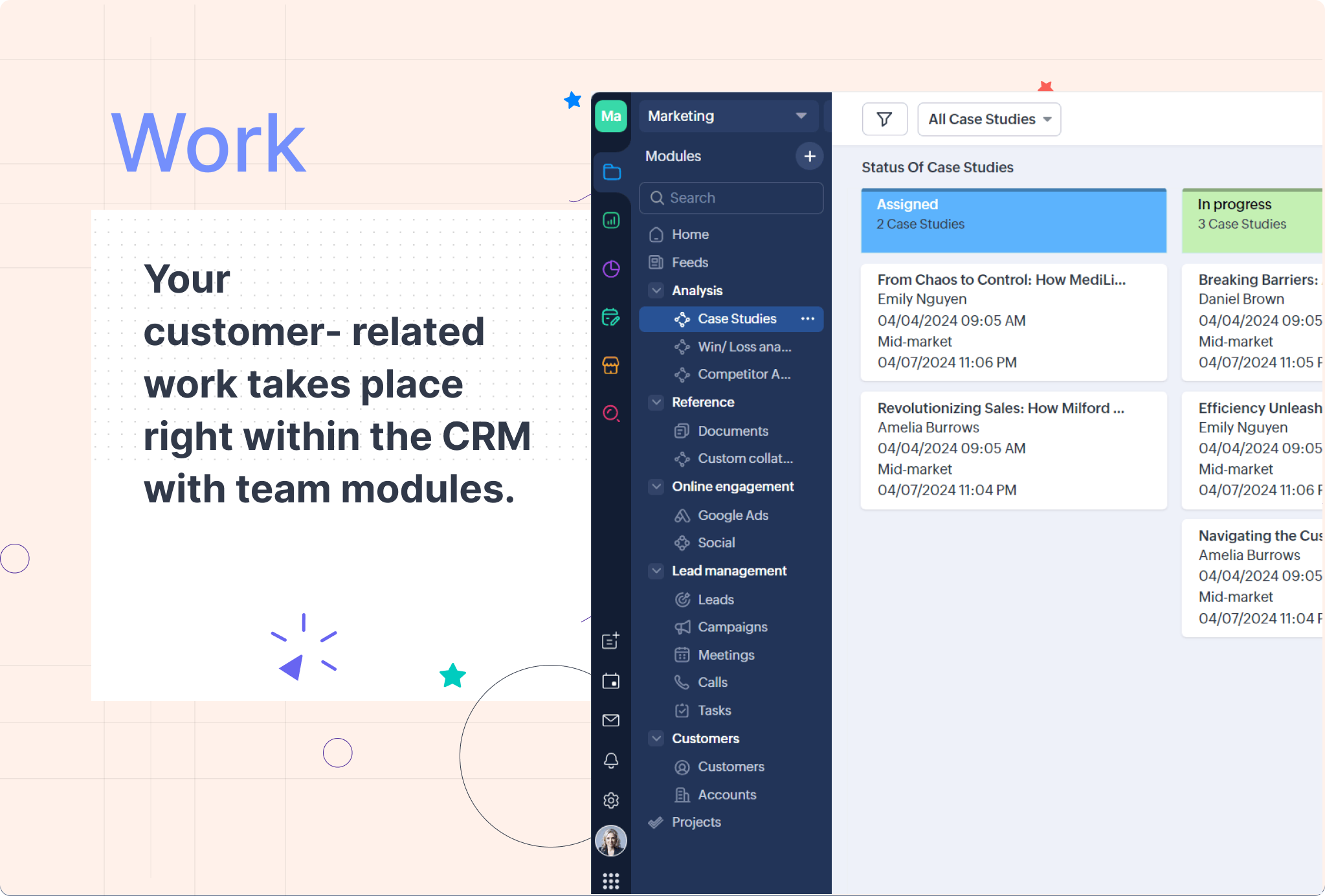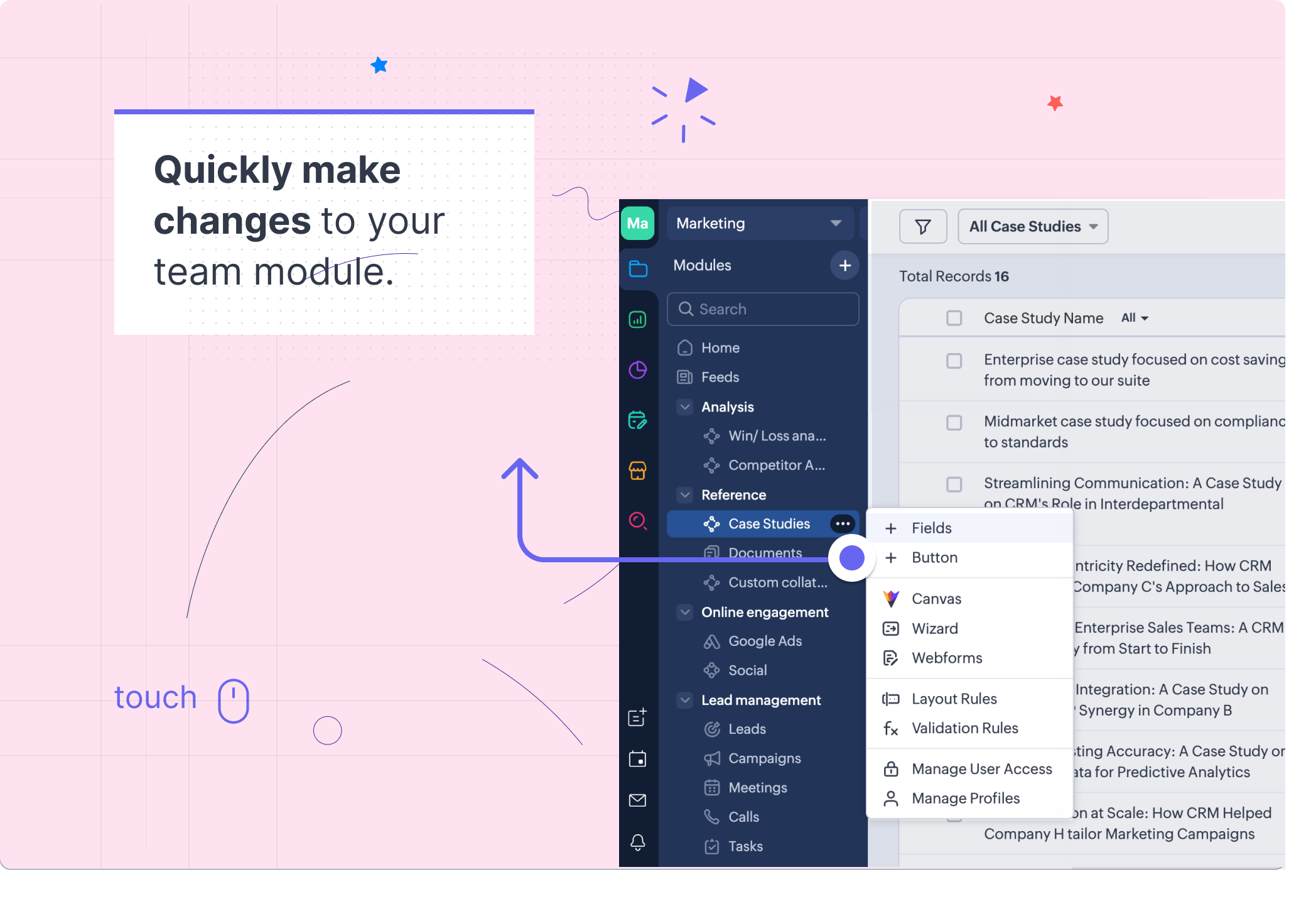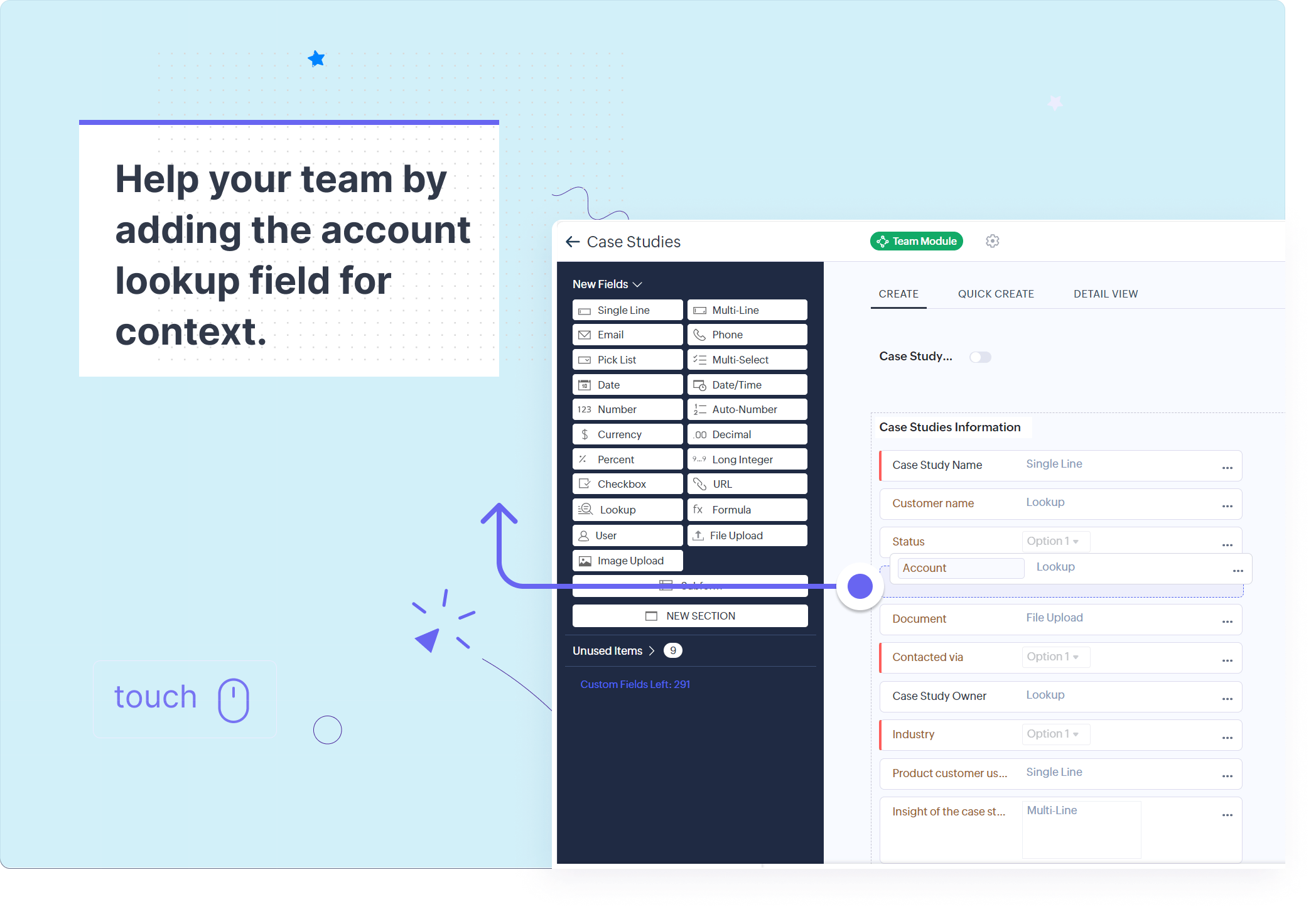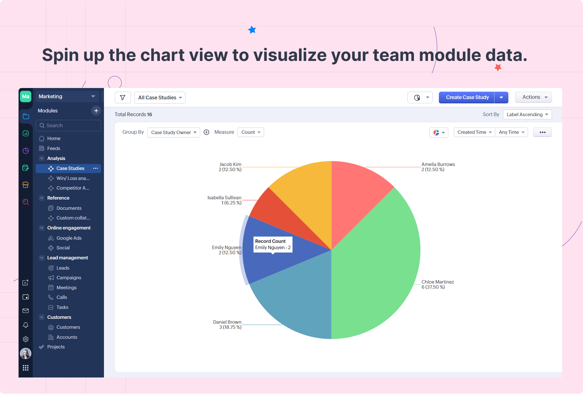 そこで、マーケティングチームのリーダーは、Zoho CRMにチームタブを作成してはどうかと考えました。