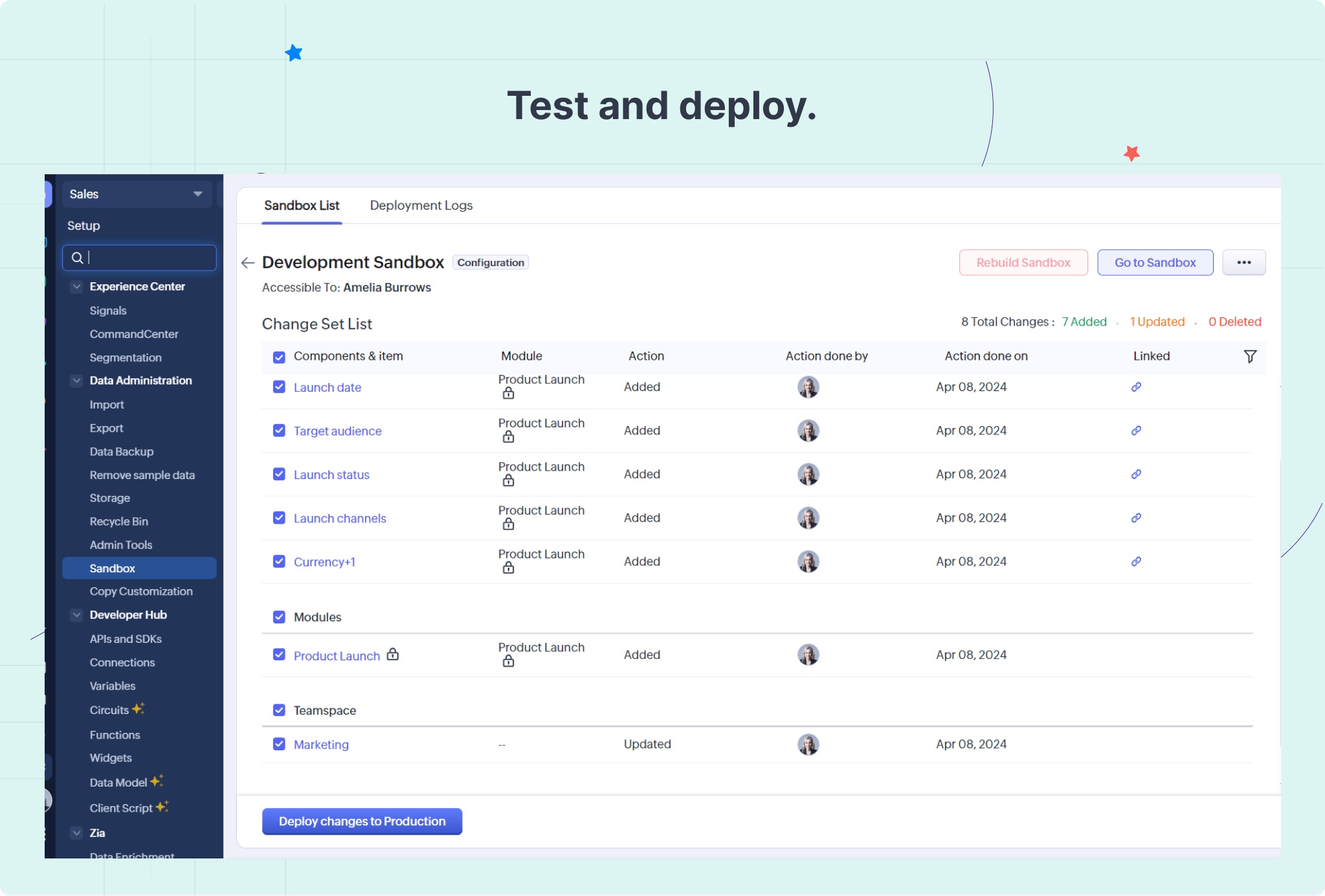 - Zoho CRMの操作画面の新バージョン(CRM for Everyone)に切り替えた後、サンドボックスの更新/再作成のボタンをクリックしたり、新しいサンドボックスを作成したりした場合、該当のサンドボックスは新バージョンの操作画面上に表示されます。ただし、旧バージョンでサンドボックスを作成した後に新バージョンに切り替え、その後サンドボックスを更新していない場合は、サンドボックスは引き続き旧バージョンの操作画面に表示されます。
