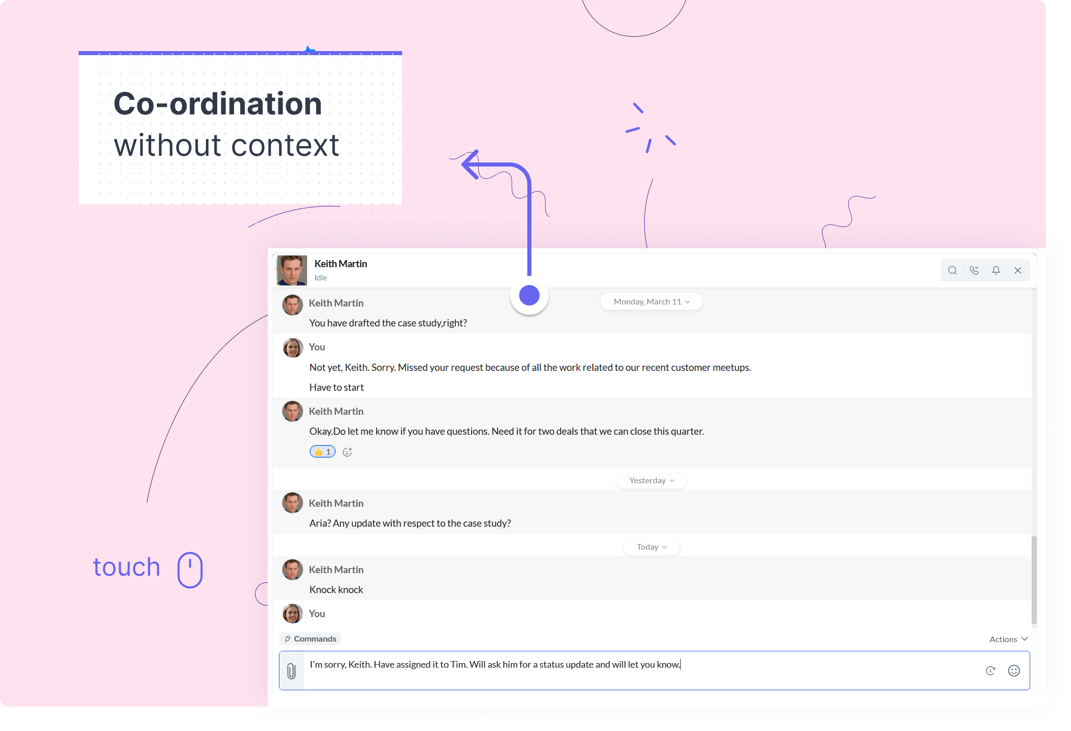- 1つ目は、他チームからの依頼の受付窓口が統一されていなかったことです。営業チームからマーケティングチームへの依頼は、チャット、電話、メールなどのさまざまな方法で行われていました。そのため、依頼をタスク化する過程で、遅延や漏れが生じることがありました。