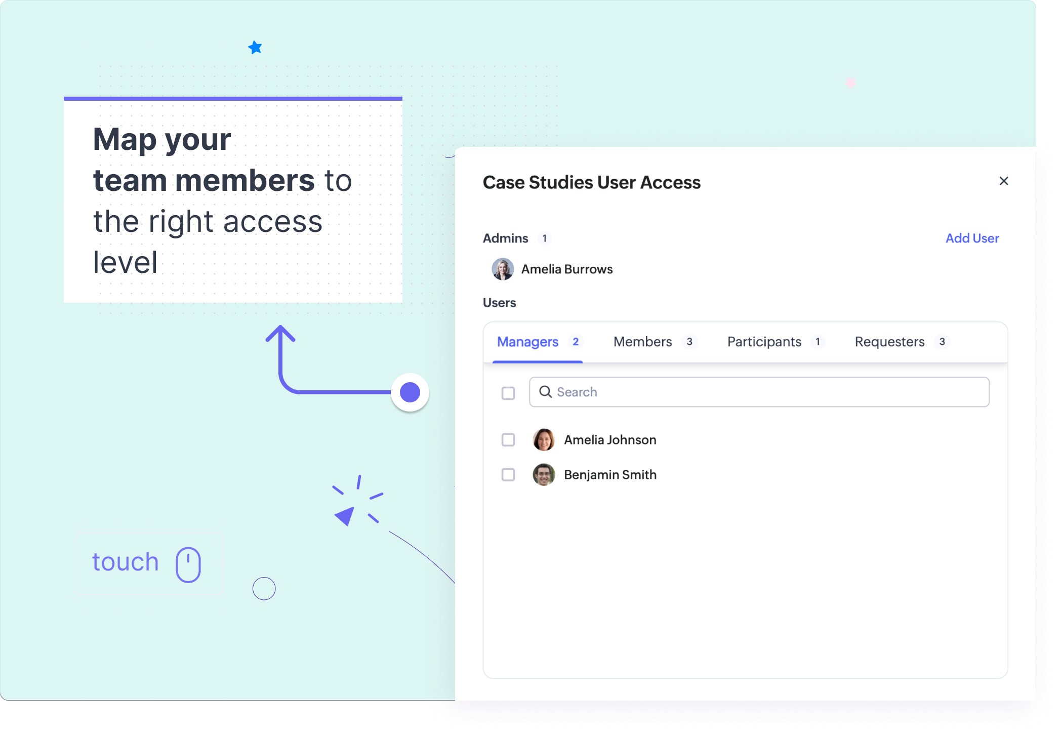 - マネージャー:マーケティング部門を管轄している副社長を割り当てました。[マネージャー]は、チームタブ内のすべてのデータを表示、編集できます。
