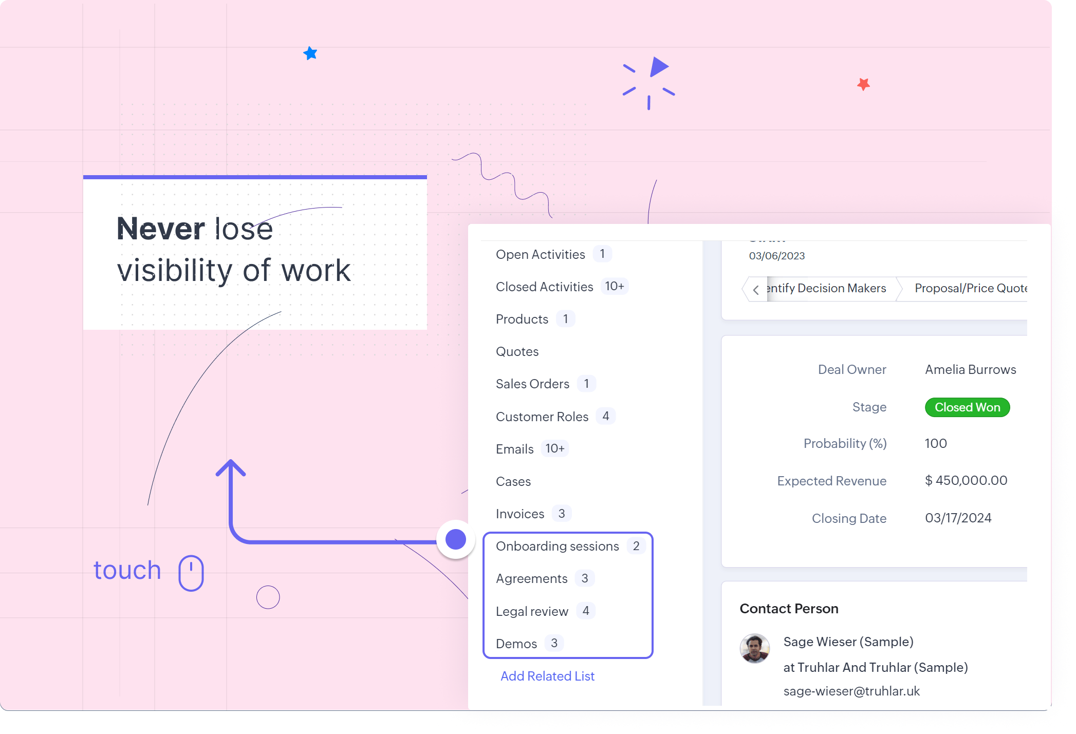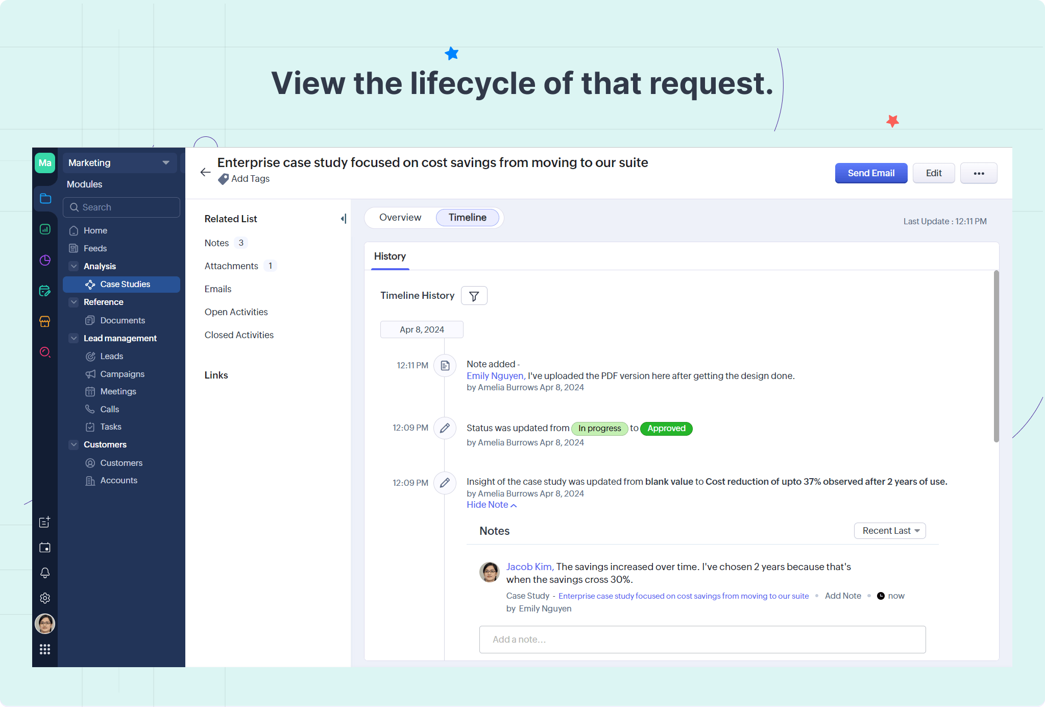チームタブによってチーム間の連携を効率的に強化できることに気がついた副社長は、社内の他のチーム(例:法務チーム、プリセールスチームなど)にもチームタブの利用を要請しました。また、各チームタブの[マネージャー]の役職には、担当の役員や管理職を追加するように依頼しました。これにより、Zoho CRMの商談、連絡先、取引先などのデータの詳細ページ(関連リスト)で、データに関連する事例、デモの予定、法務案件などをひと目で確認できるようになりました。