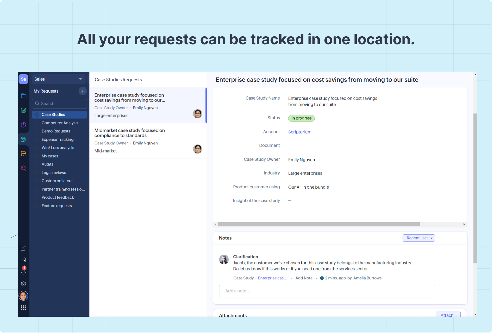 [事例]タブの導入により、営業チームでは事例をスムーズに依頼できるようになりました。