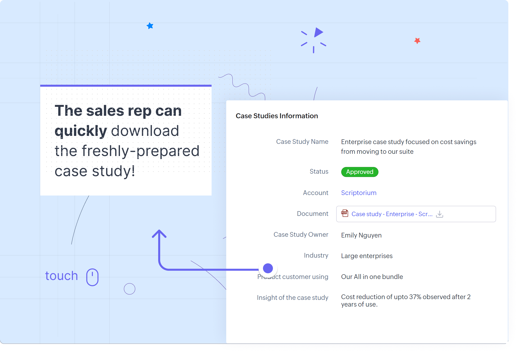 事例データの[ドキュメント]項目では、完成した事例データをかんたんにダウンロードできます。営業担当者は、ダウンロードした事例を顧客とすばやく共有し、商談の成功のために役立てることが可能です。