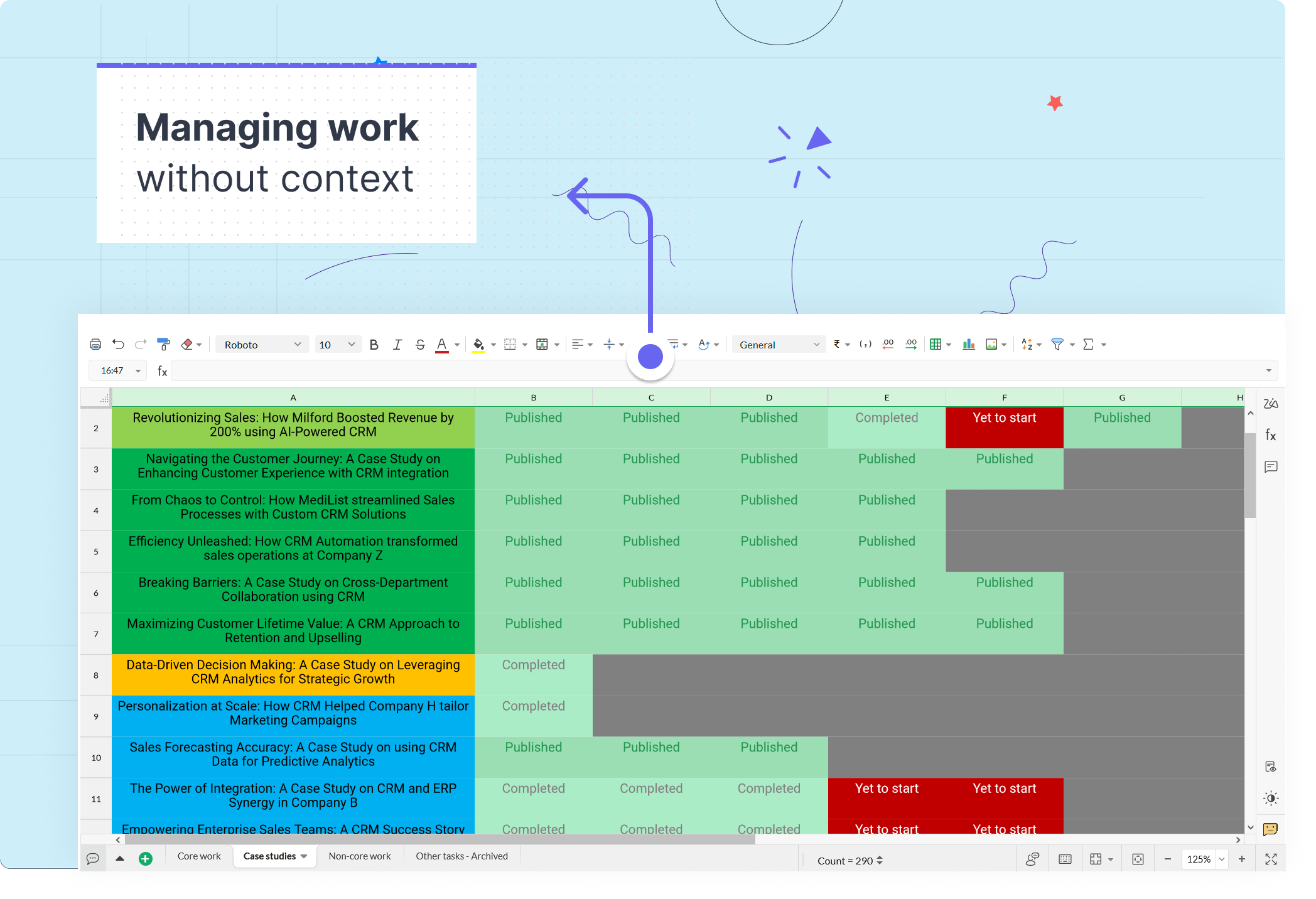 また、チームタブには、外部ツールからデータをインポートできます。このチームでは、表計算シートから事例の詳細をインポートしました。
