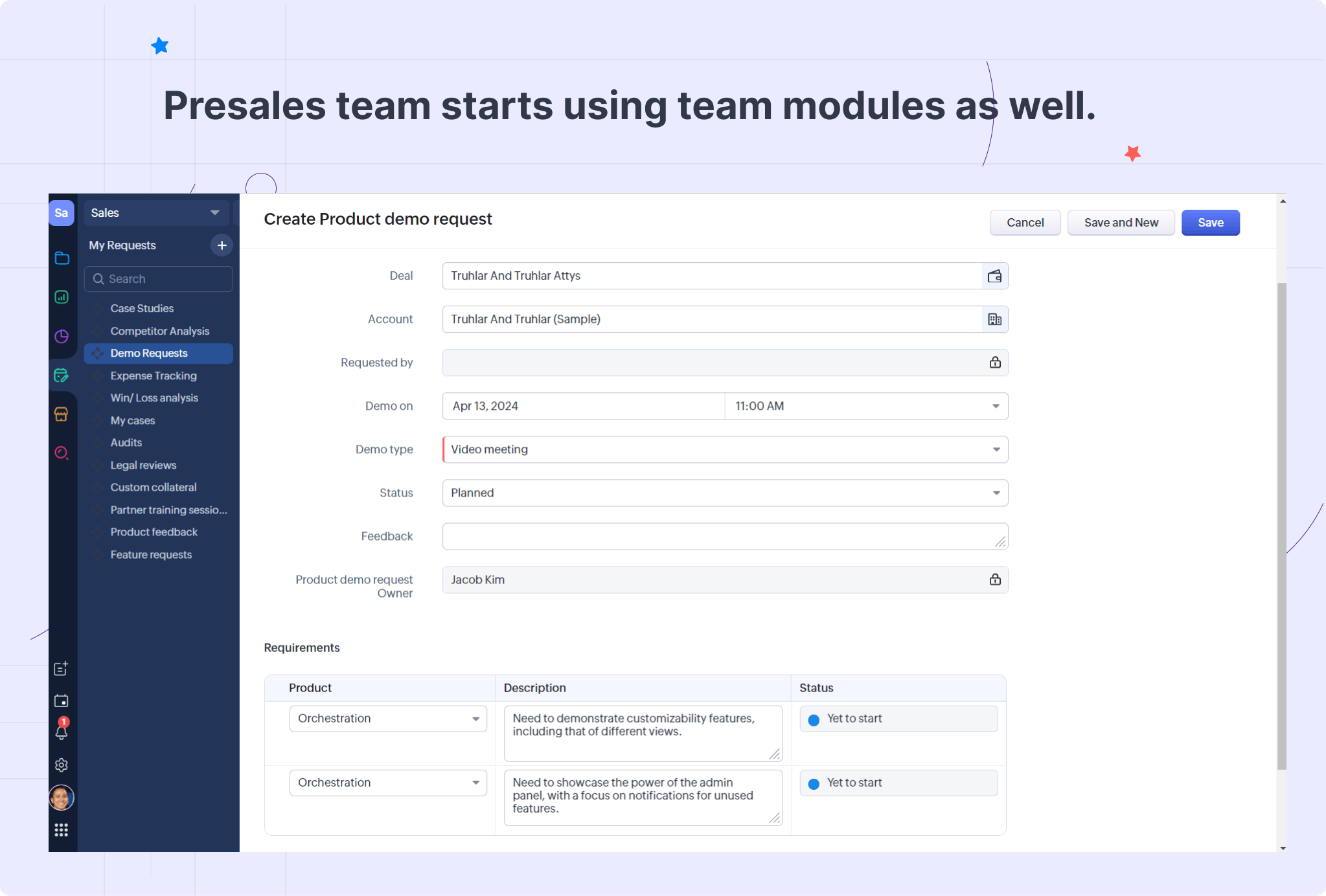 - プリセールスチーム:製品デモの依頼の受付と管理