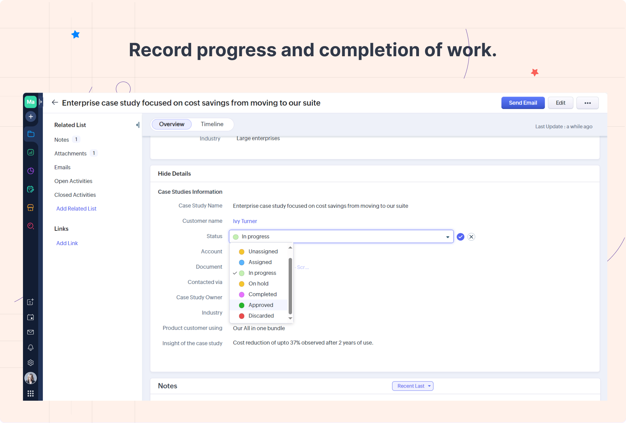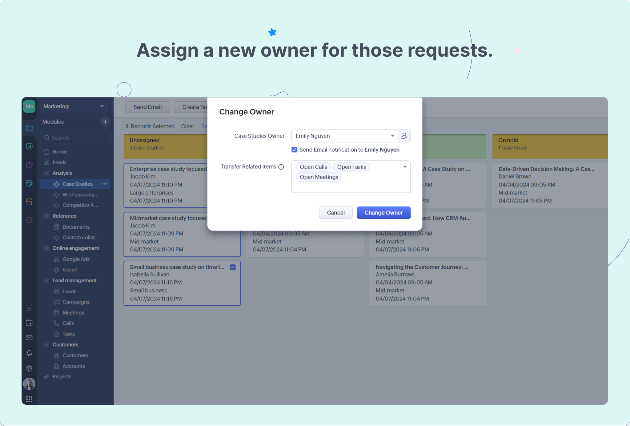 マーケティングチームでは、以下の自動化機能やプロセス管理機能を利用して、[事例]タブにおける業務を効率化するための設定を行いました。