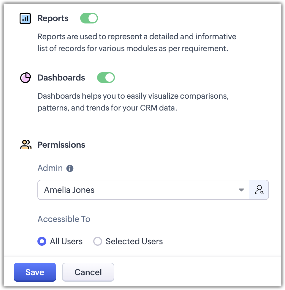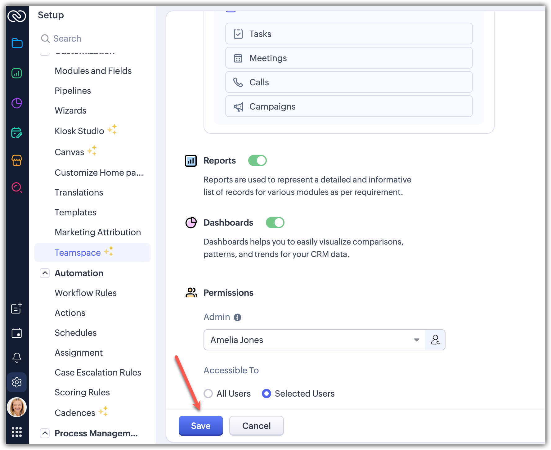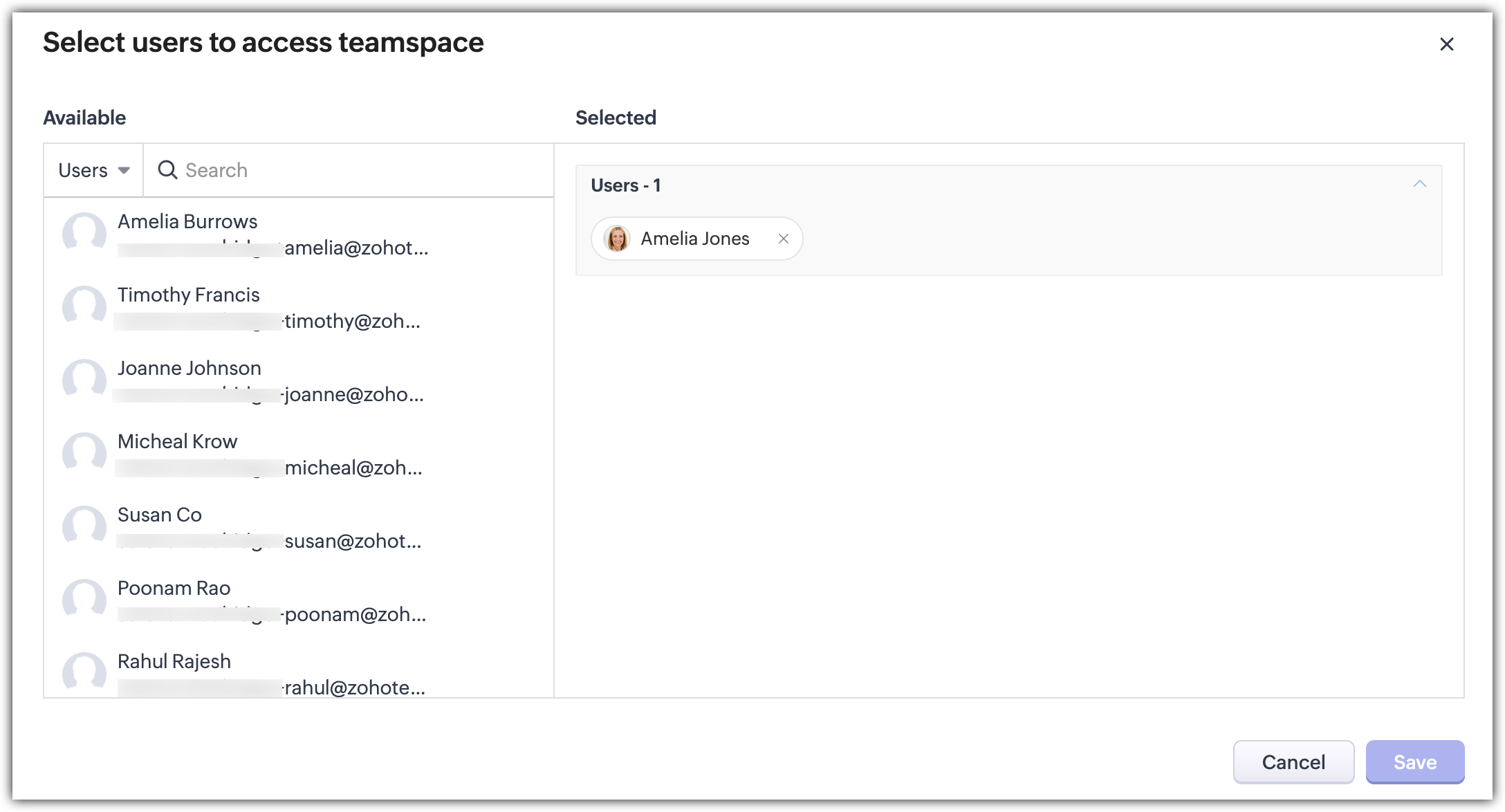 2. チームスペース管理者には、任意のZoho CRMユーザーを指定できます(権限設定にかかわらず、Zoho CRMユーザーであれば誰でもチームスペース管理者になることができます)。チームスペース管理者に指定されたユーザーは、チームスペースの設定を変更できます。