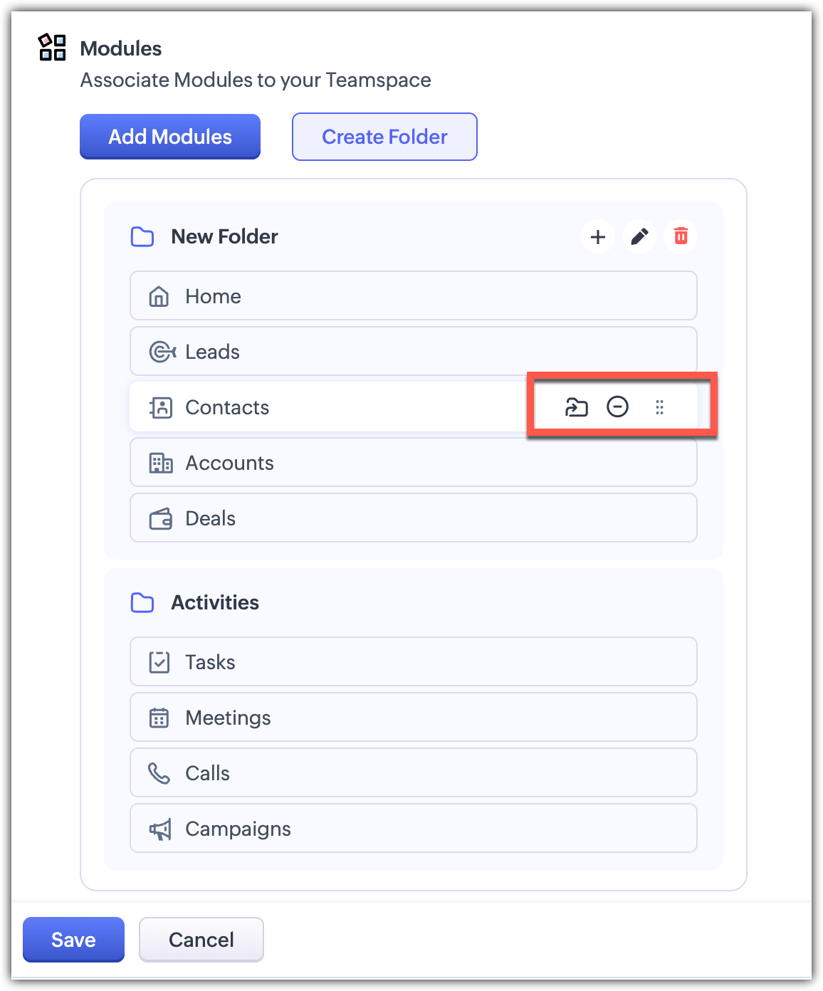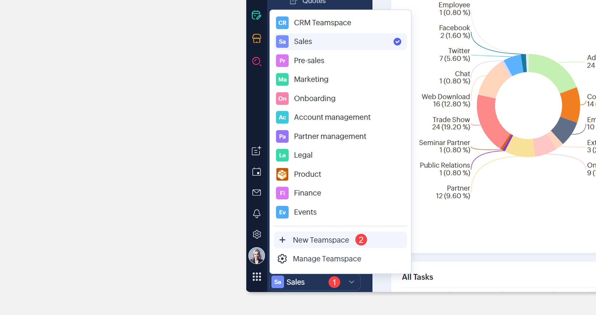 1. 画面左側のメニューにおけるチームスペースのタブの管理操作(追加、削除、並べ替え)は、Zoho CRMの管理者、[チームスペースの管理]の権限を持つユーザー、チームスペース管理者のみが実行できます。