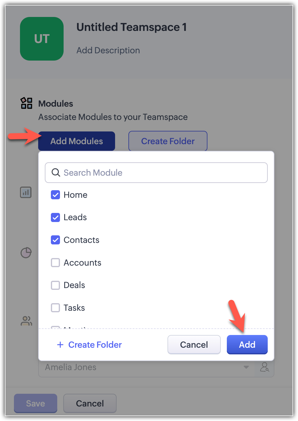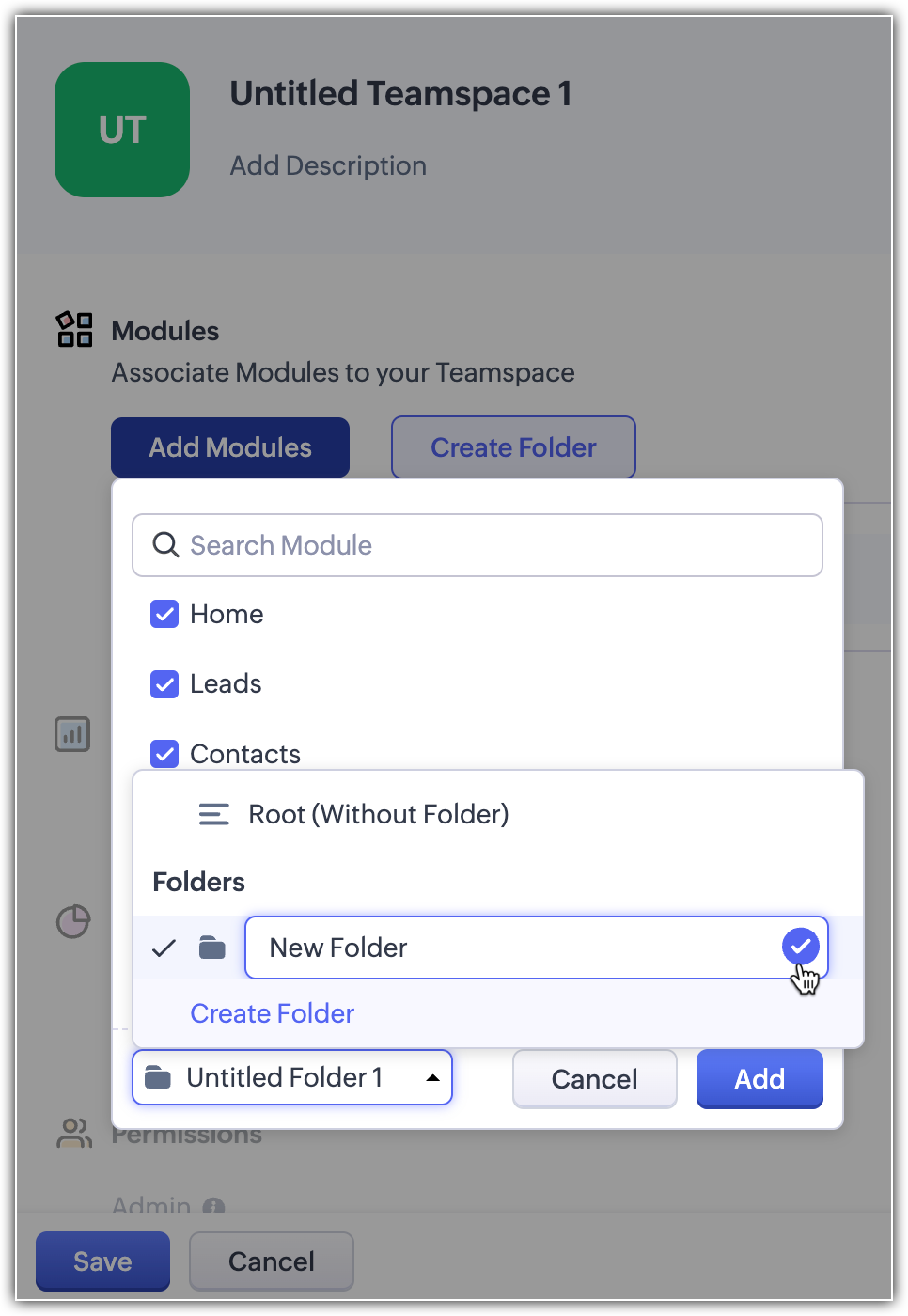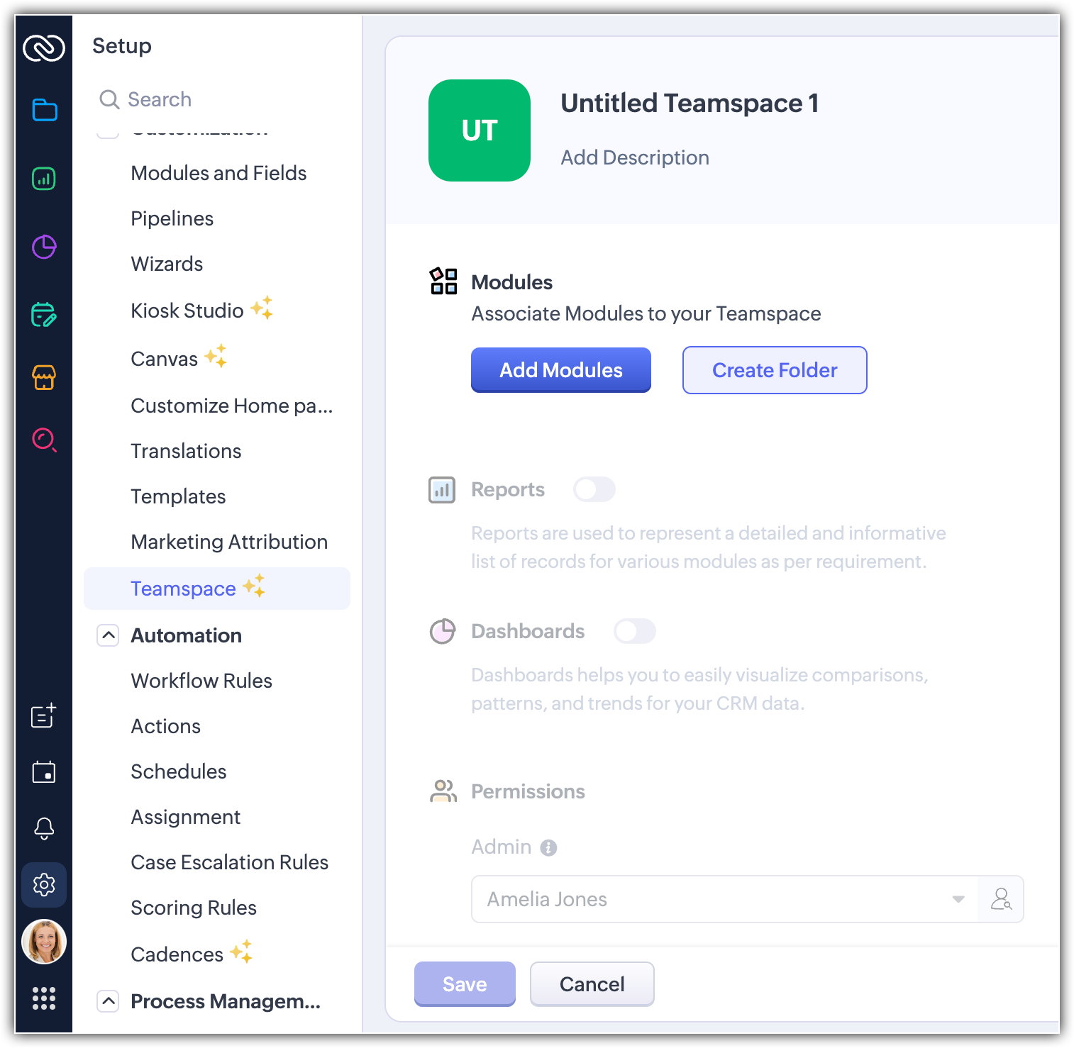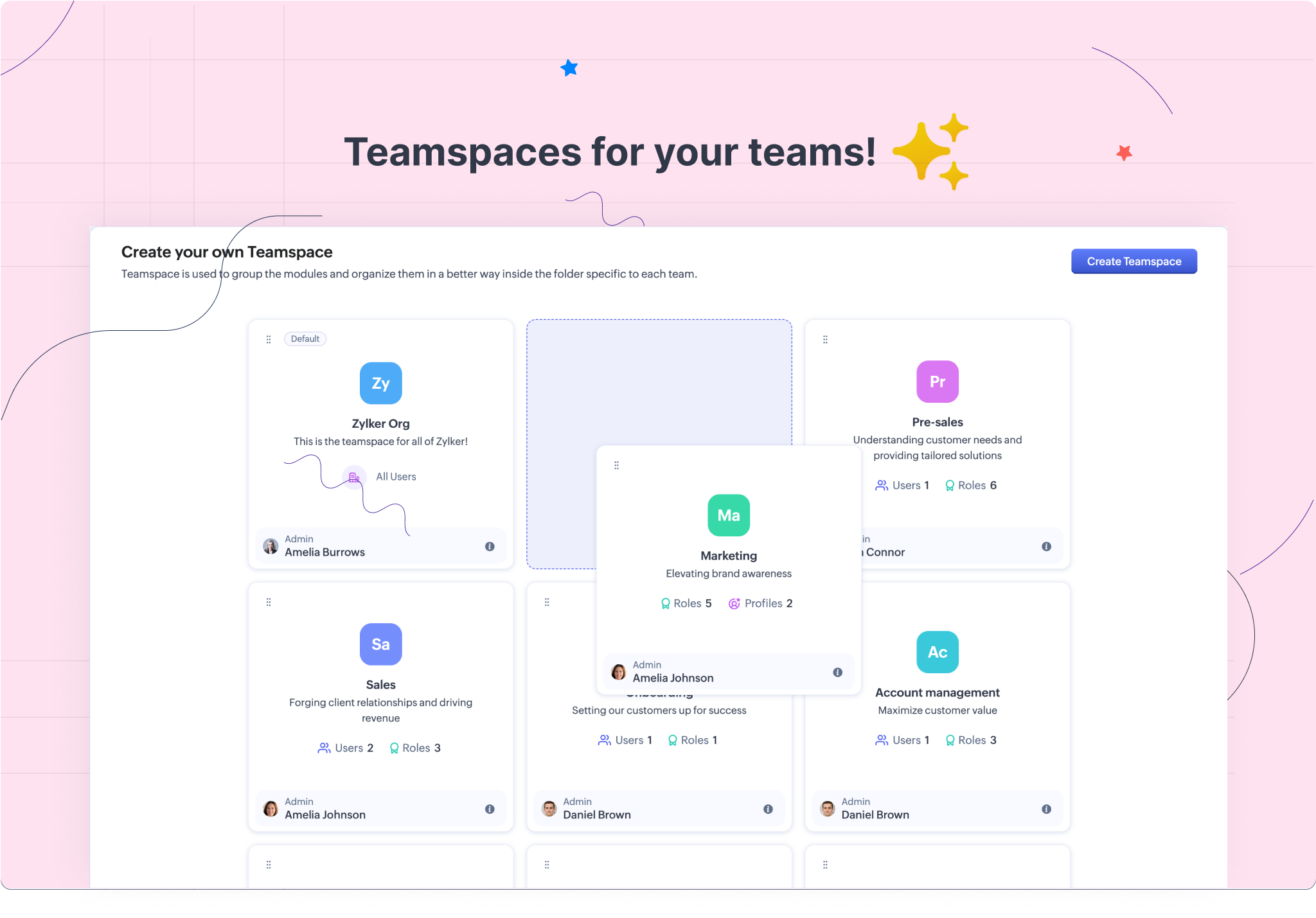 3. [チームスペースの管理]の権限を持つユーザーは、Zoho CRM内のすべてのチームスペースを管理できます。