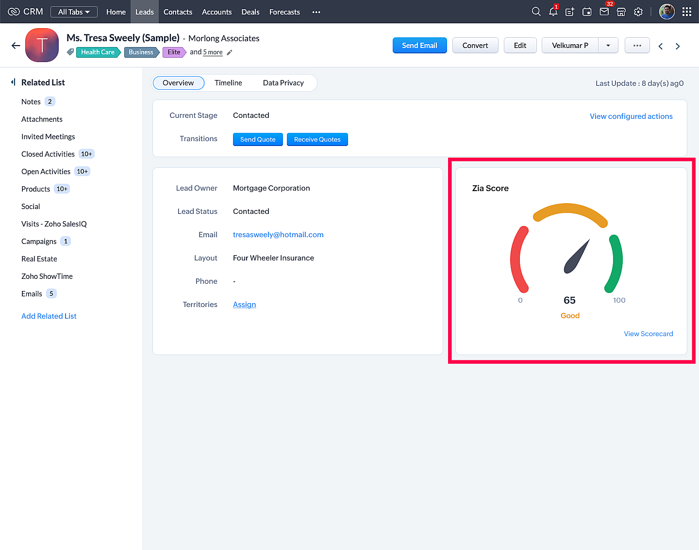 Zoho CRMの組織でZiaスコアを有効にすると、対象のタブのレイアウトに[Ziaスコア]というカスタム項目が追加されます。これにより、Zoho CRMの他の機能に影響が及ぶ場合があります。また、Ziaスコアの項目は、自動処理(例:ワークフロールール、ブループリント、承認プロセス)の実行条件や処理対象、データの抽出条件(例:フィルター、データ一覧、監査ログ)などに利用できます。
