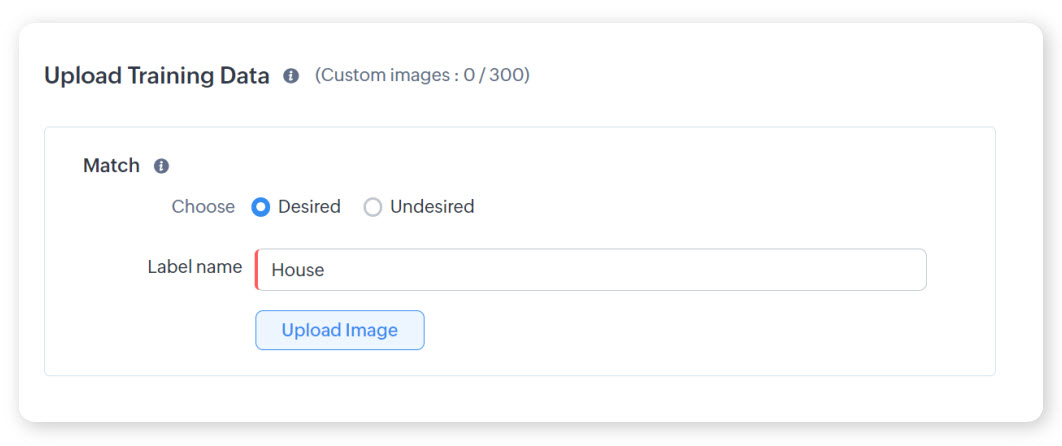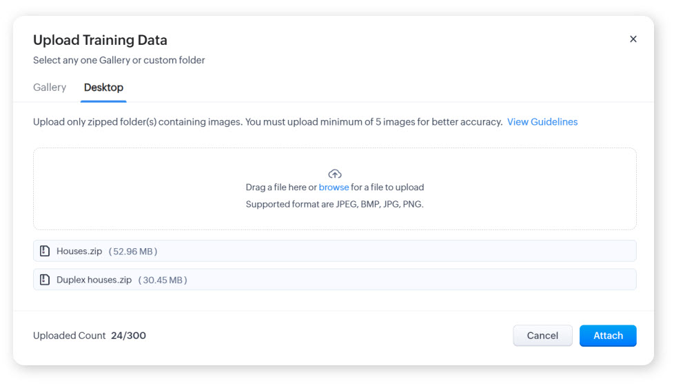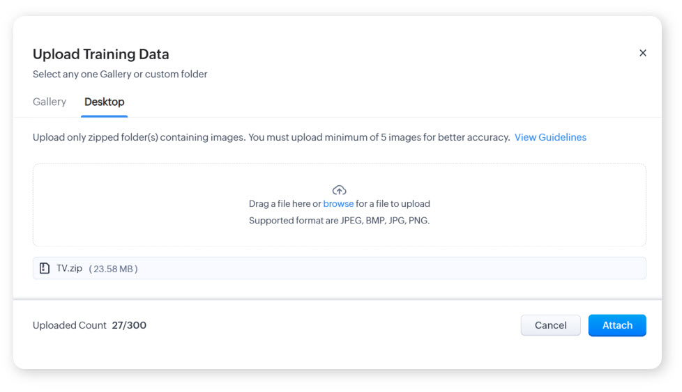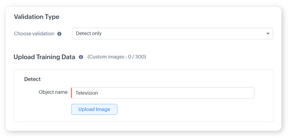 また、独自の画像データをアップロードして、Ziaをトレーニングすることもできます。トレーニングするには、1つの検出対象(ラベルまたは対象物)に対して、5件以上の画像データをアップロードする必要があります。