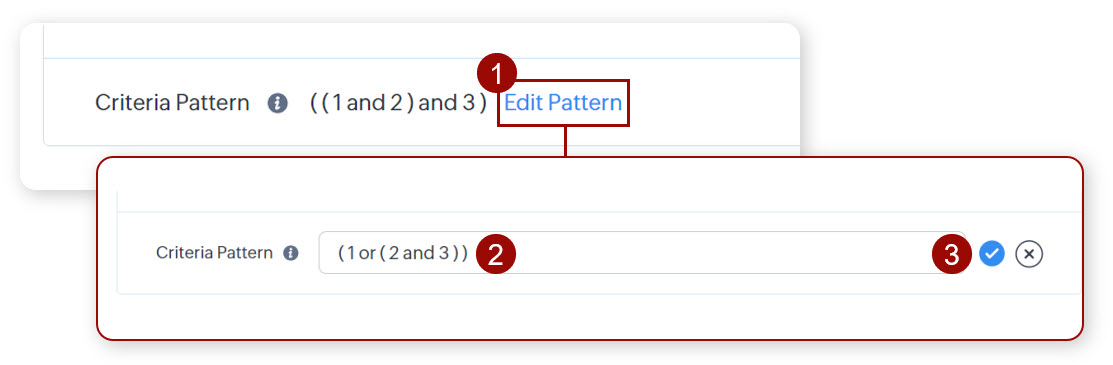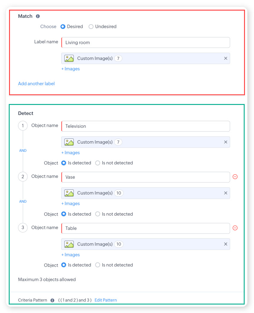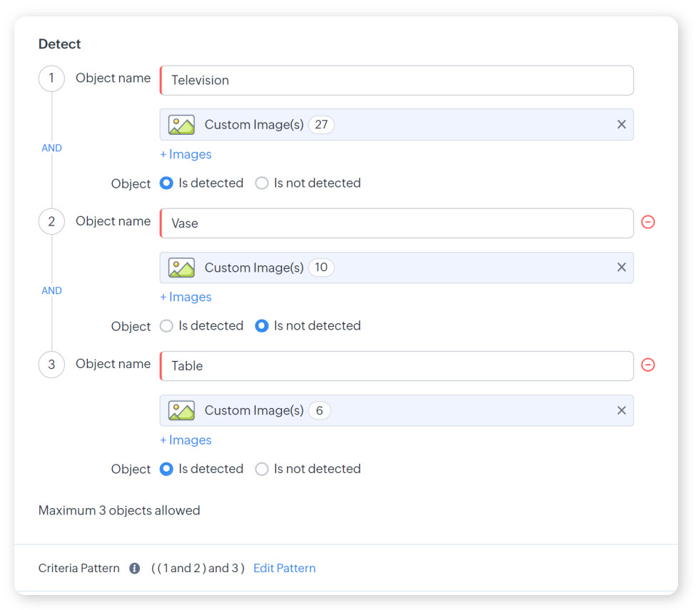 対象物を複数追加した場合は、条件パターンを編集できます。編集するには、[パターンを編集する]をクリックし、条件式を編集してから完了アイコンをクリックします。たとえば、対象物として、1. テレビ、2. テーブル、3. 花瓶の3つを設定しているとします。この場合、条件を「(1 or (2 and 3))」に指定すると、「テレビ単体」、「テーブルと花瓶のセット」、「テレビとテーブルと花瓶のすべて」のいずれかのパターンで対象物が写っている画像が適切とみなされます。