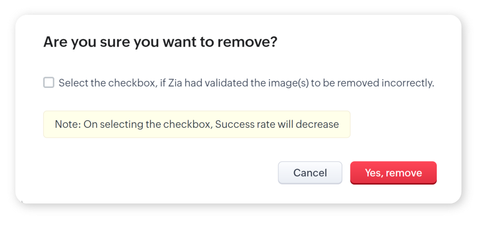 また、Zia画像検証によって検証済みの画像も、必要に応じてデータから削除することも可能です。対象の画像がZiaによって誤って登録された画像である場合は、削除時に表示される確認画面でその旨のチェックボックスを選択します。このチェックボックスを選択した上で削除を確定すると、Ziaに誤検出が通知され、モデルの成功率は低下します。