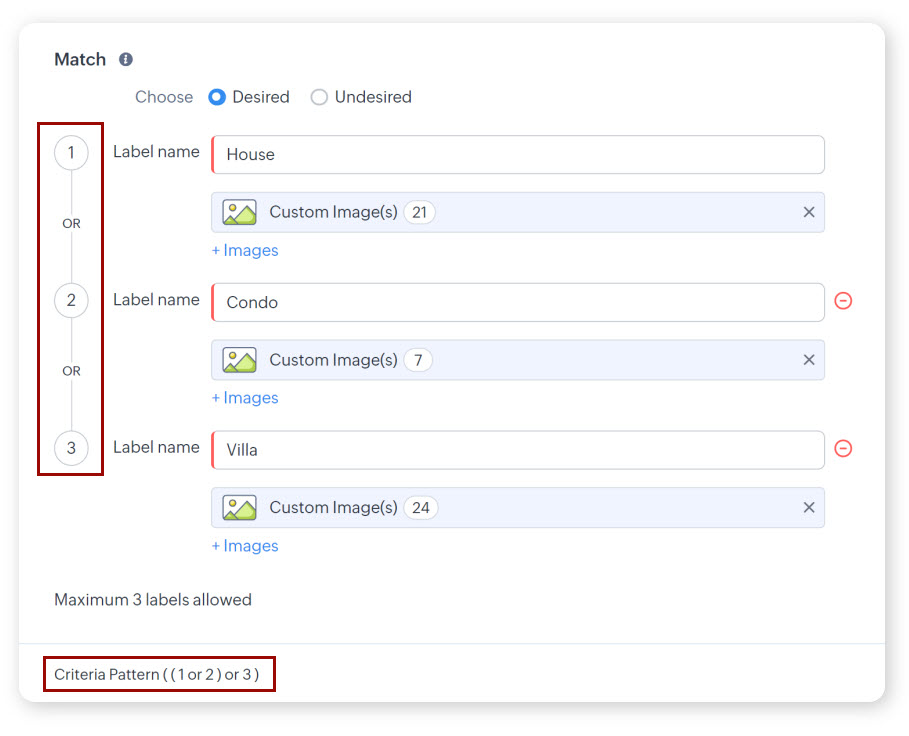 - [照合のみ]の種類の検証では、画像内に複数のラベル(検出対象)が写っているかどうかを検証することはできません(1件のラベルが画像の80%以上を占めることを前提としているためです)。1件の画像検証ルールに対して複数のラベルが設定されている場合、いずれか1件のラベルが識別されると、適切な画像とみなされます。このように、照合の種類の検証においては、ラベル同士に常にOR条件が適用されます。この条件パターンをカスタマイズすることはできません。