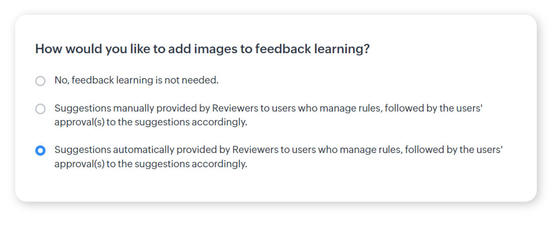 [学習のフィードバック用に画像を追加する方法]の設定欄では、Ziaによって不適切と識別された画像を承認者が承認したときの処理として、以下のいずれかを指定できます。