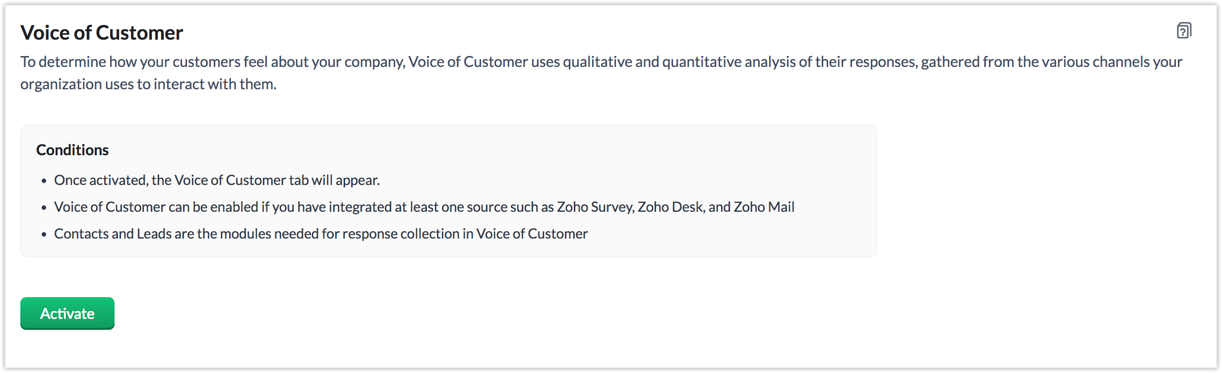 Zoho CRMアカウントの管理者は、以下の手順によって、設定画面から顧客の声分析を有効にできます。