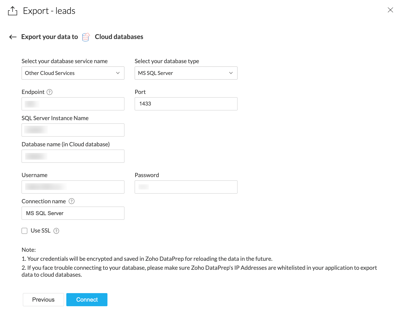 メモ: データベースへの接続で問題が発生した場合は、Zoho DataPrepのIPアドレスがご利用のアプリケーションでホワイトリストに登録されていることをご確認ください。クラウドデータベースへのデータのエクスポート時に必要です。こちらをクリックすると、Zoho DataPrepのIPアドレスについてご確認いただけます。
