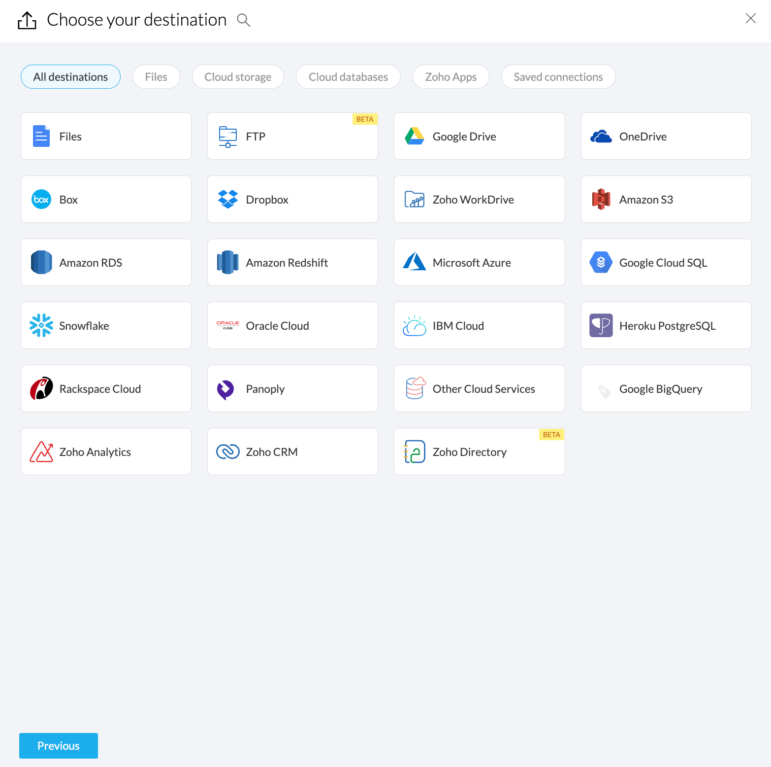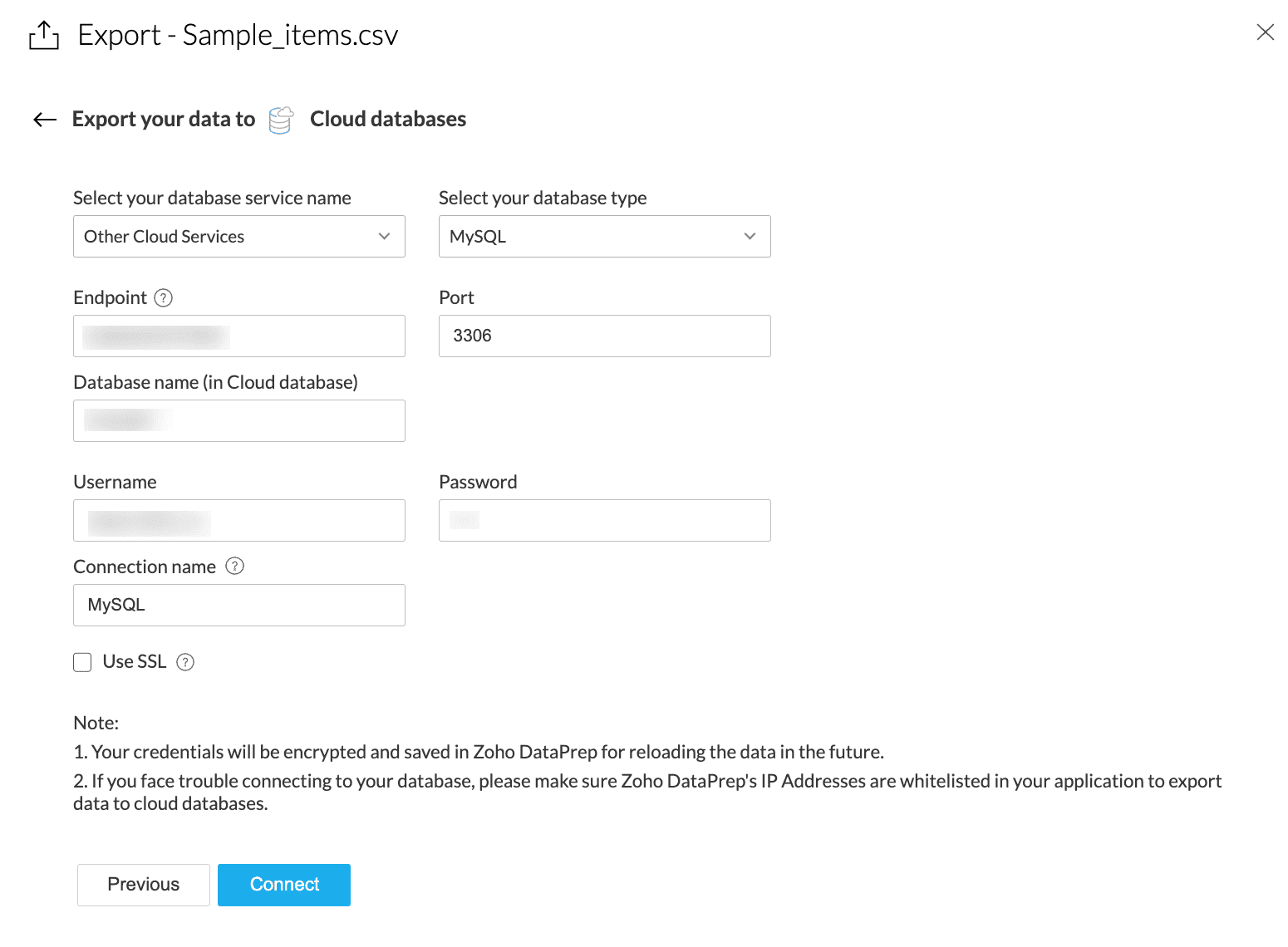 メモ: データベースへの接続に問題が発生した場合は、アプリケーションでZoho DataPrepのIPアドレスがホワイトリストに登録されていることを確認し、クラウドデータベースへのデータのエクスポートを行ってください。こちらをクリックして、Zoho DataPrepのIPアドレスについてご確認ください。