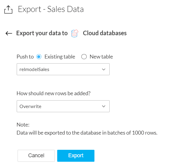 11. 既存 tableオプションを選択した場合、DataPrepのデータセットからデータベースのテーブルへの新規行のエクスポート方法は2通りあります。