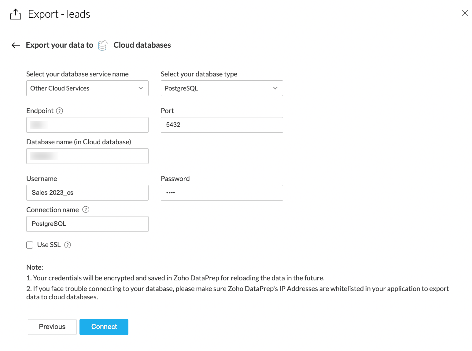 メモ: データベースへの接続に問題がある場合は、Zoho DataPrepのIPアドレスがアプリケーションでホワイトリストに登録されていることを確認し、クラウドデータベースへのデータエクスポートを行ってください。Zoho DataPrep IPアドレスについては