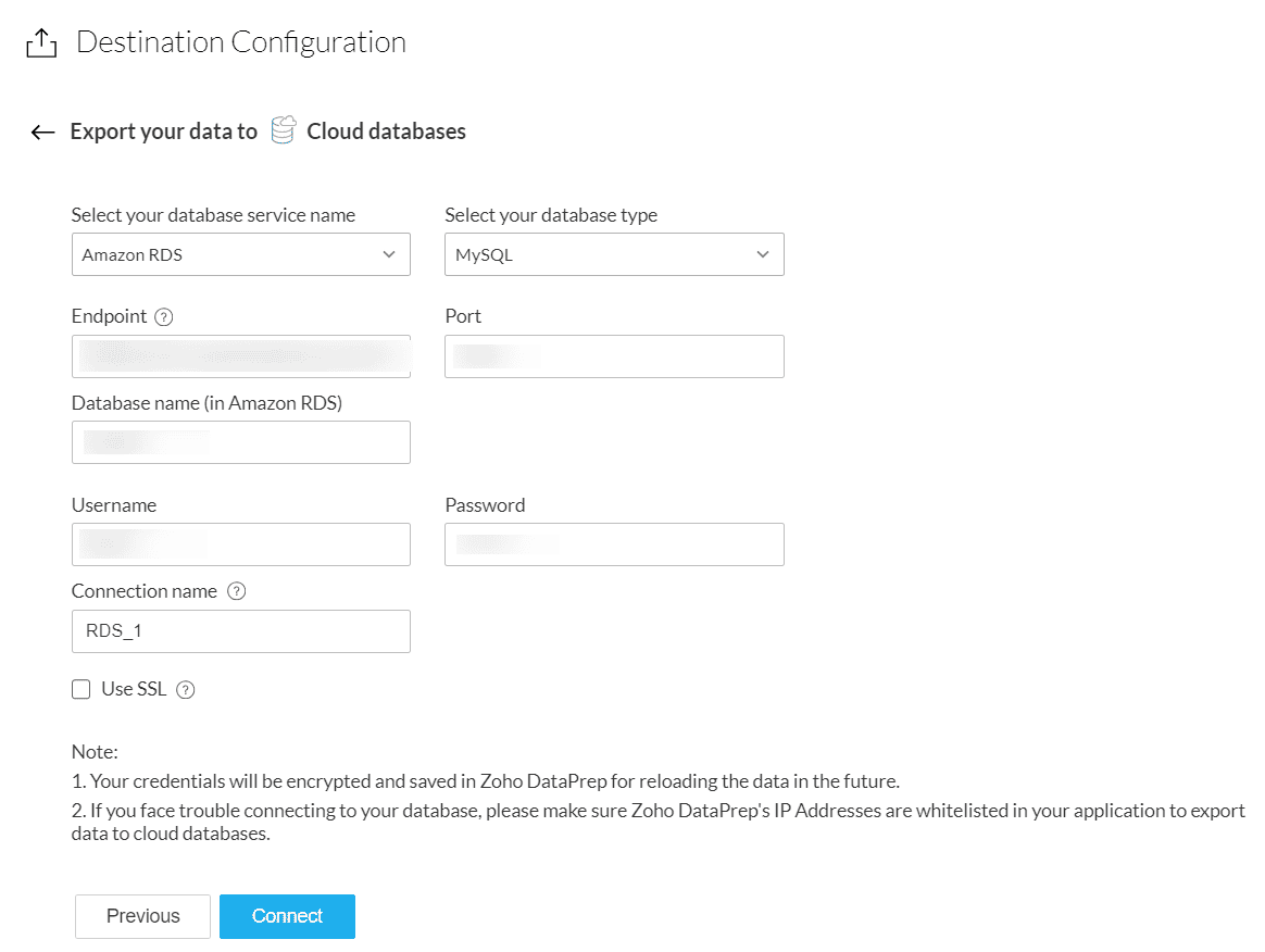 メモ: データベースへの接続で問題が発生した場合は、Zoho DataPrepのIPアドレスがご利用のアプリケーションでホワイトリストに登録されているかご確認ください。これにより、クラウドデータベースへのデータエクスポートが可能となります。