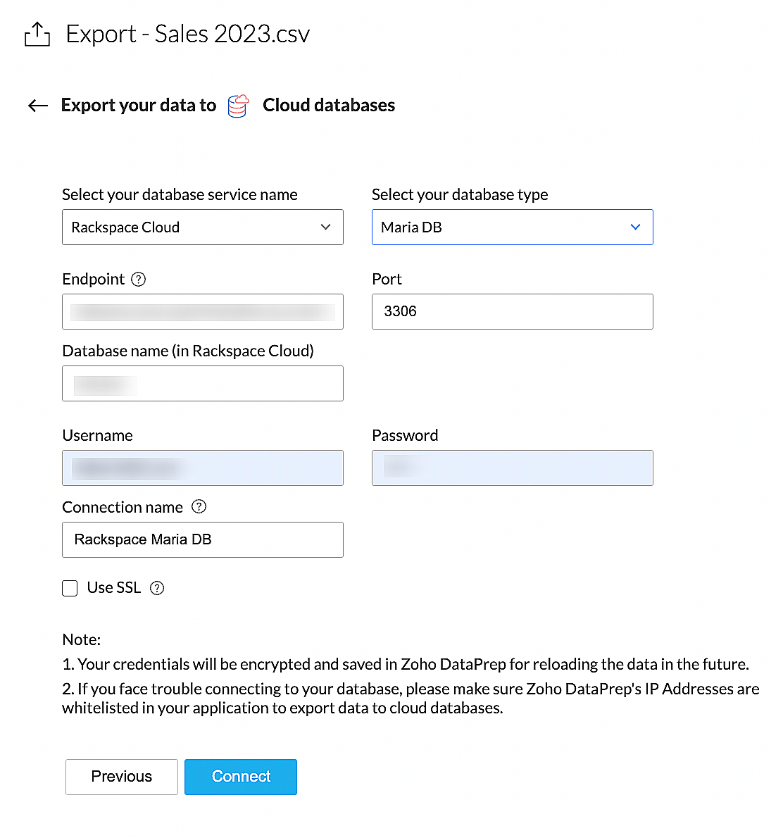 メモ: データベースへの接続に問題が発生した場合は、アプリケーションでZoho DataPrepのIPアドレスがホワイトリストに登録されていることを確認してください。これにより、クラウドデータベースへのデータのエクスポートが可能です。 こちらをクリックして、Zoho DataPrepのIPアドレスをご確認ください。