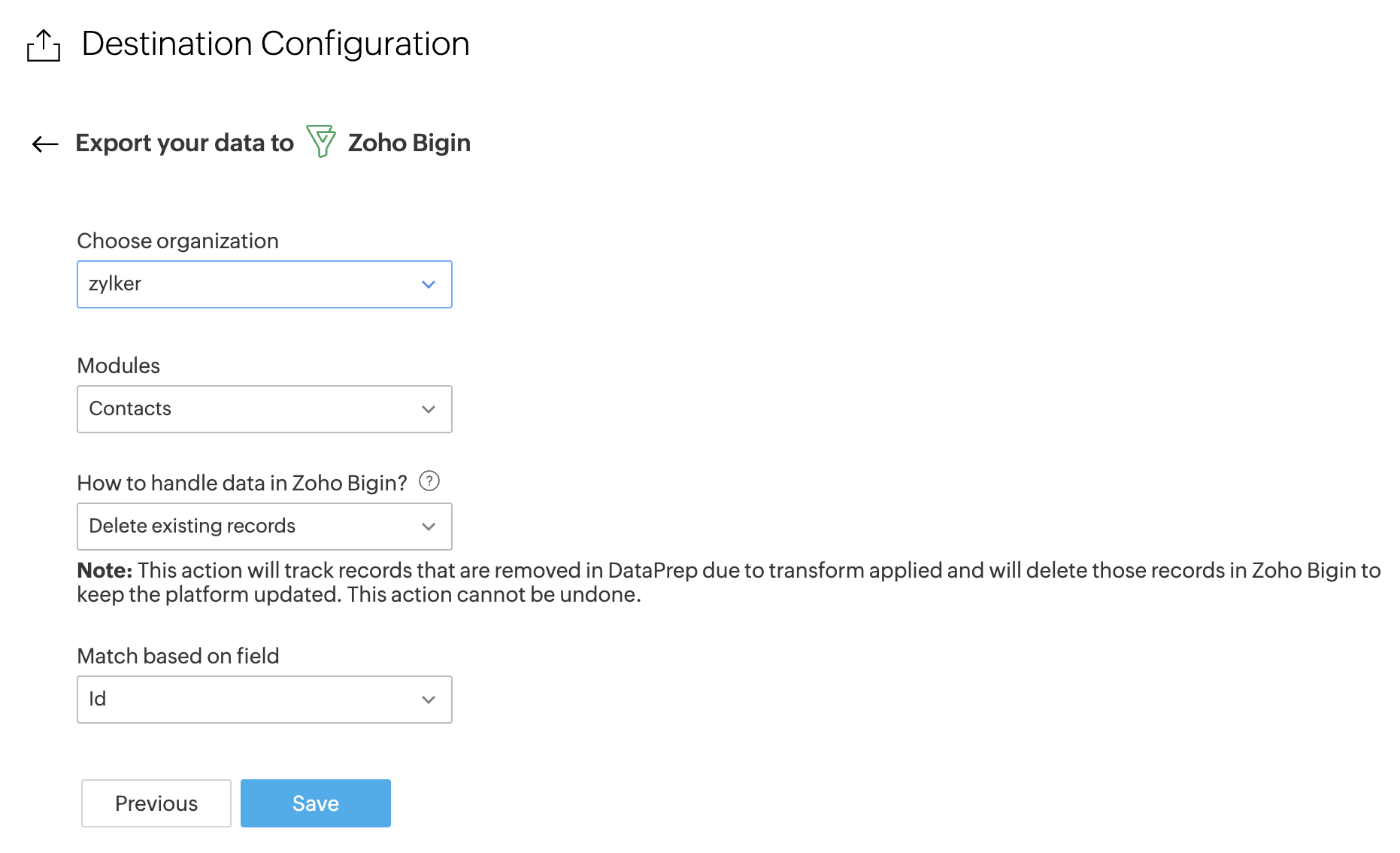 既存データの削除: このオプションを選択すると、DataPrepで変換申請により削除されたデータを追跡し、Bigin内の該当データを削除してプラットフォームを最新状態に保ちます。本操作は元に戻すことができません。