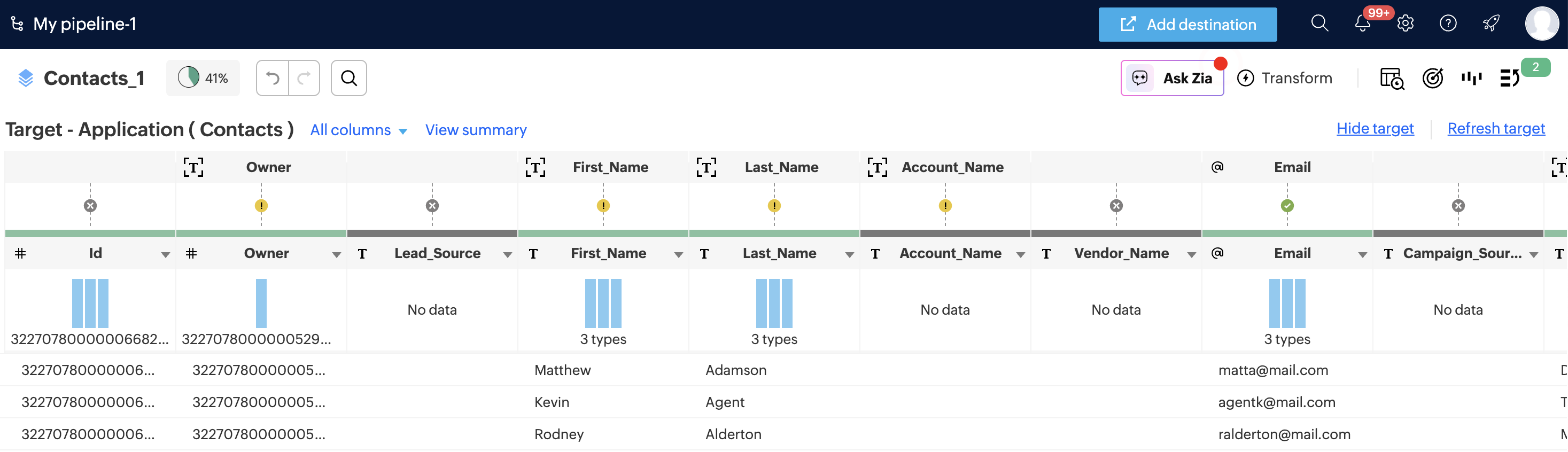 ターゲットマッチングでは、照合済みおよび未照合の列に異なるアイコンや提案が表示されます。これらの提案をクリックすることで、既存の列をターゲット列に素早く照合できます。エラーの修正を容易にするため、Zoho Biginタブ内のターゲットタブがデータのターゲットとして紐付けられます。DataPrep Studioページでデータとテーブルのマッピング、および不一致がある箇所のエラーも確認できます。エラーアイコンにカーソルを合わせて内容を確認し、クリックして各エラーを解決できます。
