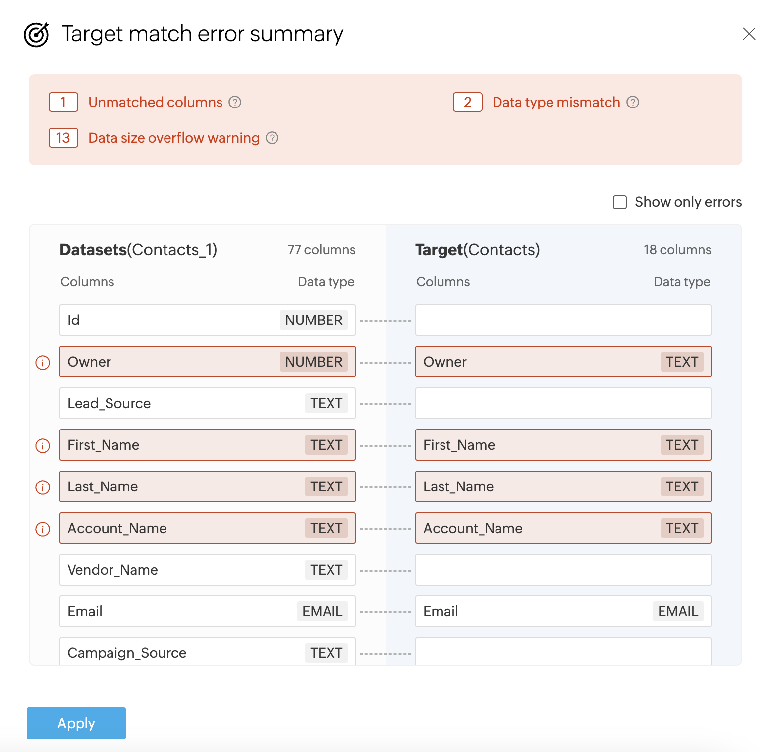 2. 概要を表示リンクをクリックすると、ターゲット照合エラーの概要が表示されます。概要では、さまざまなモデル照合エラーと、それぞれのエラーに関連付けられた列の数が示されます。必須エラー列をクリックし、適用をクリックして特定のエラー列だけをフィルターすることもできます。