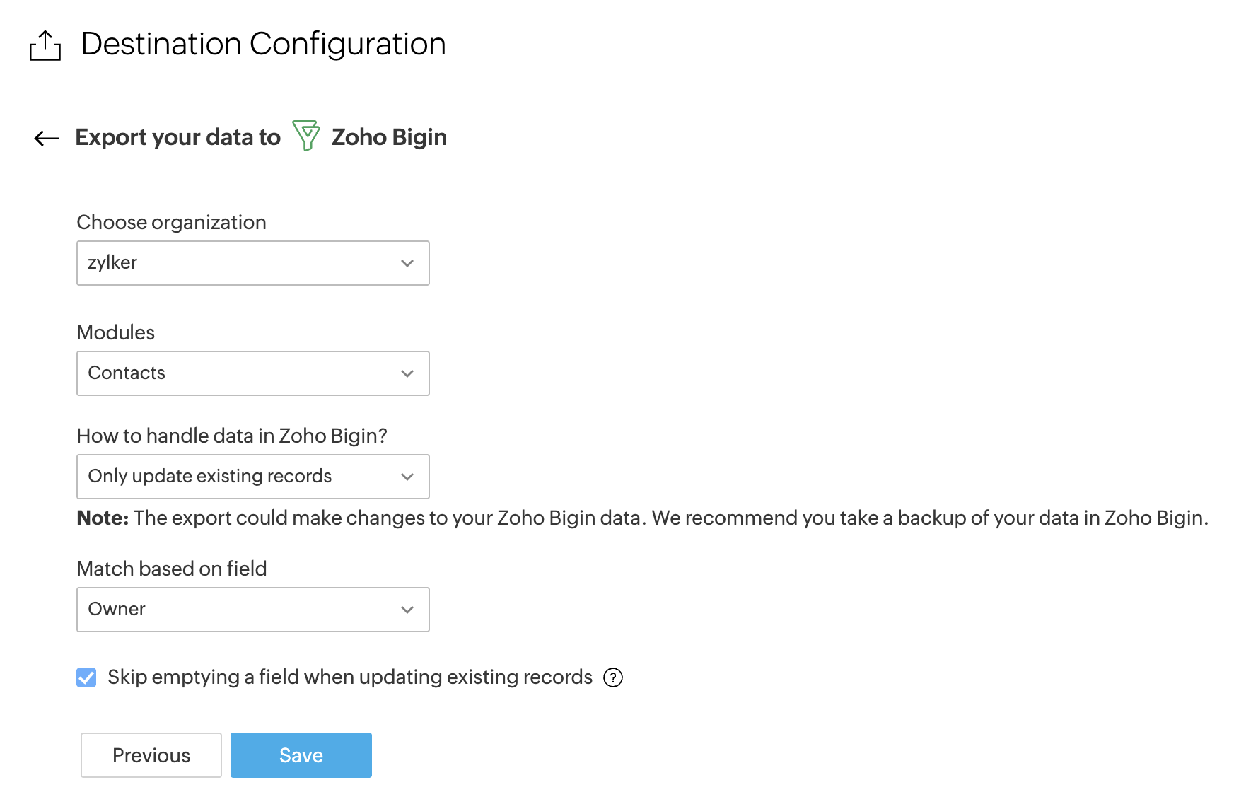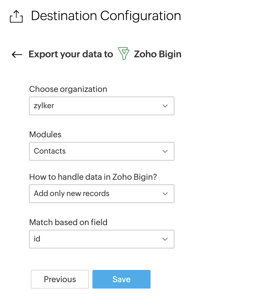 7. Zoho Biginへエクスポートするデータの処理方法を決定するため、以下の設定のいずれかを選択してください。