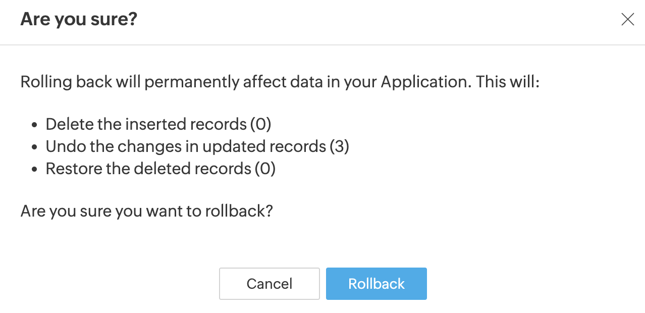 部分的なエクスポート失敗時、Rollback機能を利用してZoho Biginタブに対する変更を元に戻すかキャンセルすることができます。ロールバックは、追加されたデータの削除、更新されたデータの変更取り消し、削除されたデータの復元をサポートします。