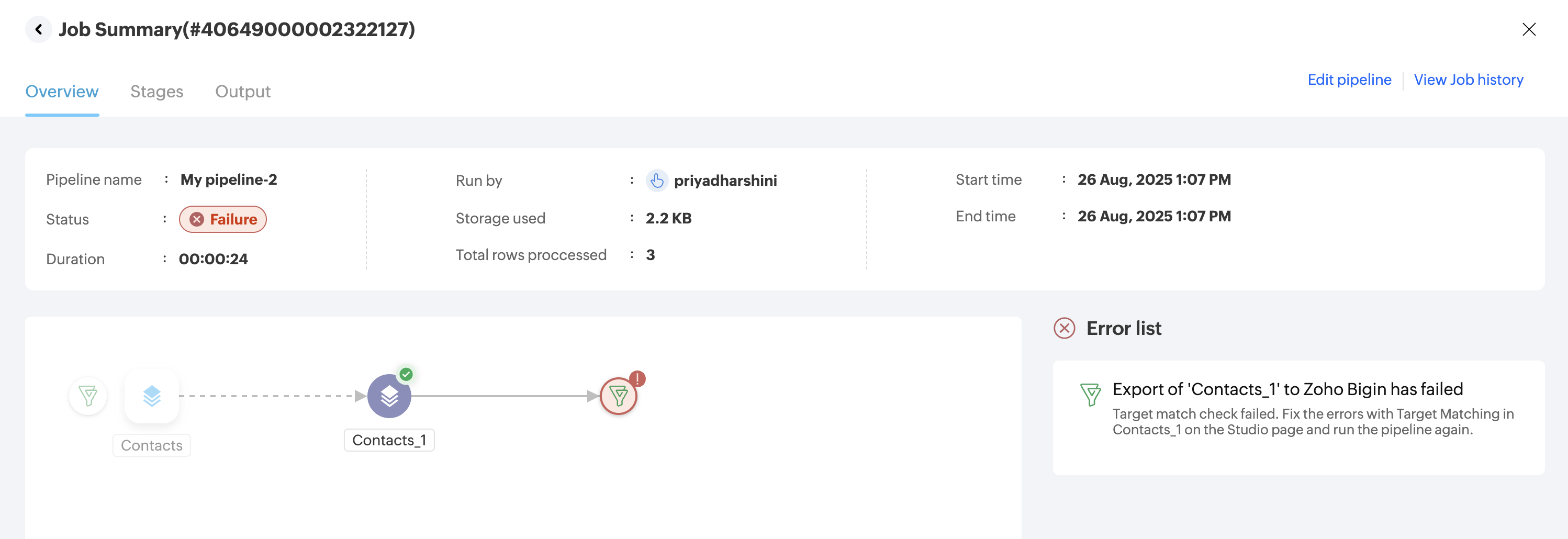 情報:各実行はジョブとして保存されます。パイプライン実行時には、データソースから取得済みのデータが各ステージで申請済みの一連の変換処理を経て準備され、最終的に宛先へエクスポート済みとなります。この完了した一連のプロセスは