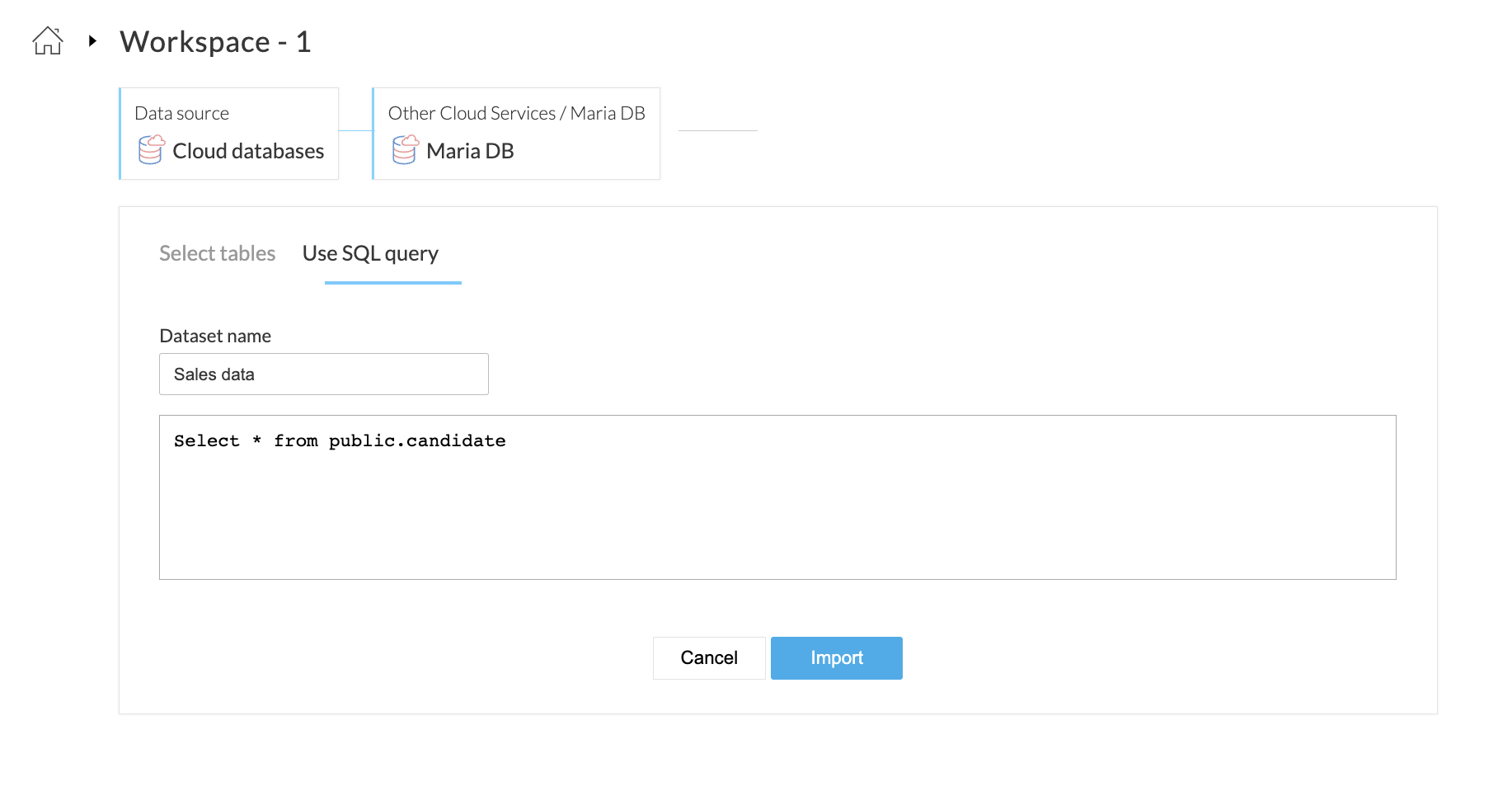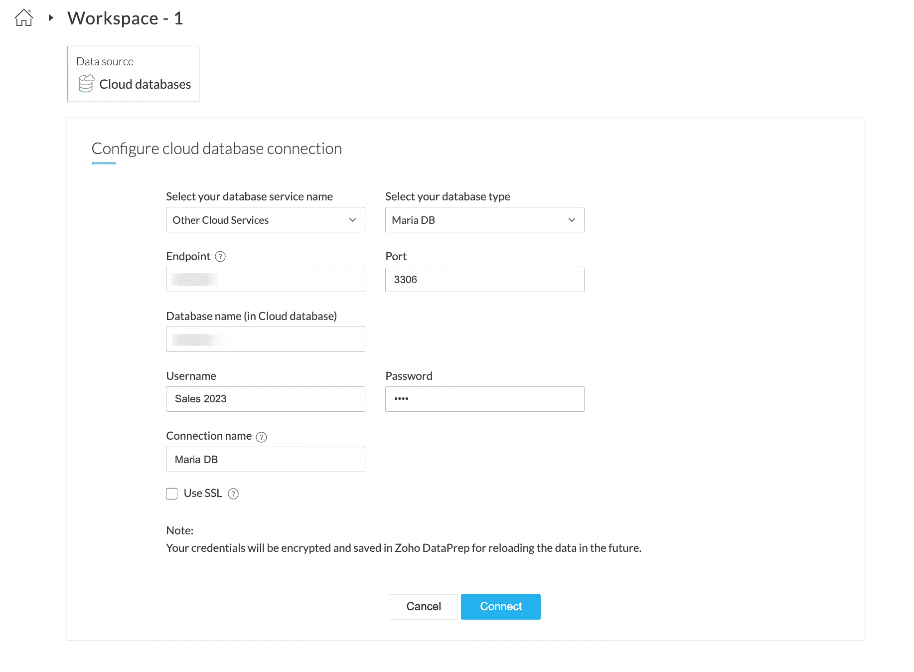 メモ: すでに Other Cloud サービス - Maria DB 接続を追加済みの場合は、Saved 外部連携カテゴリーで該当する接続を選択し、インポートを続行してください。保存済み外部連携の詳細については、こちらをご覧ください。