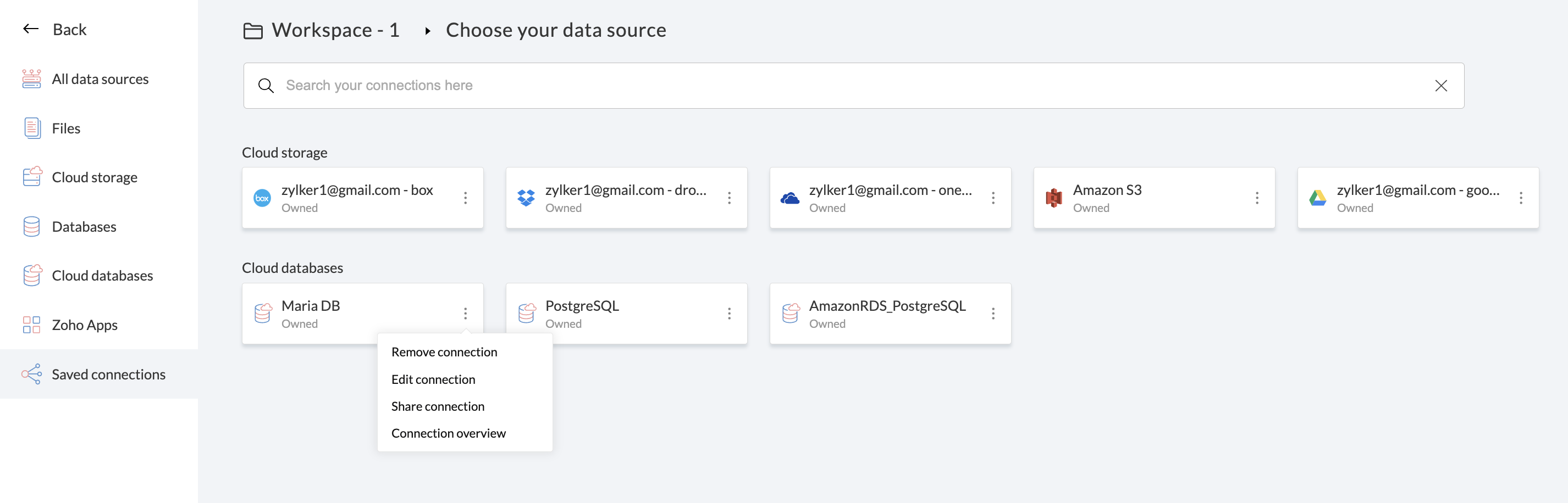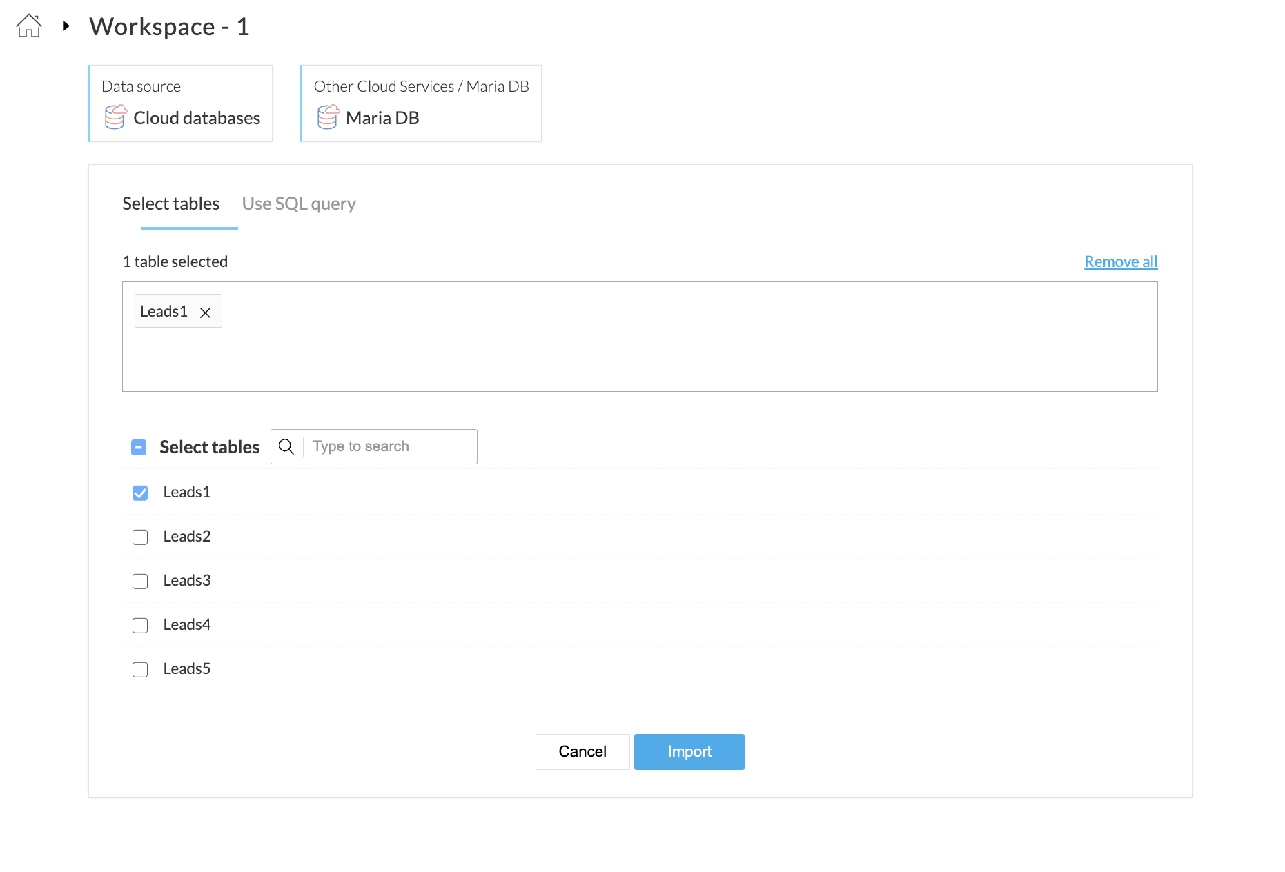 Zoho DataPrepは、Maria DBなどの他のクラウドサービスからのデータインポートに対応しています。Maria DBは、テーブルにデータを保存するオープンなデータ元のリレーショナルデータベース管理システム(RDBMS)です。