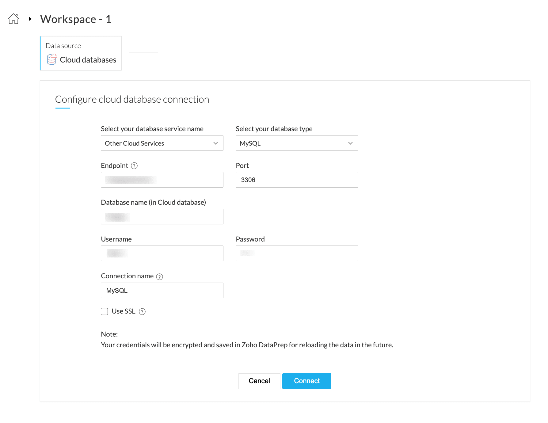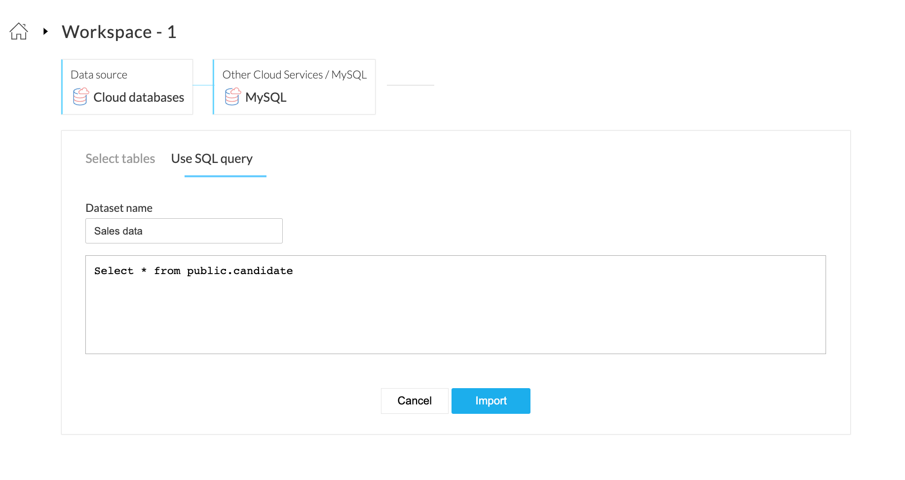 メモ: 追加済みの Other Cloud サービス - MySQL 接続がある場合は、Saved 外部連携カテゴリーから必要な接続を選択し、インポートを続行してください。Saved 外部連携について詳しくは、こちらをご覧ください。