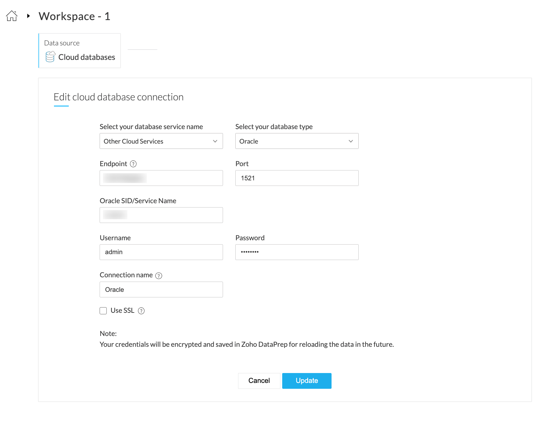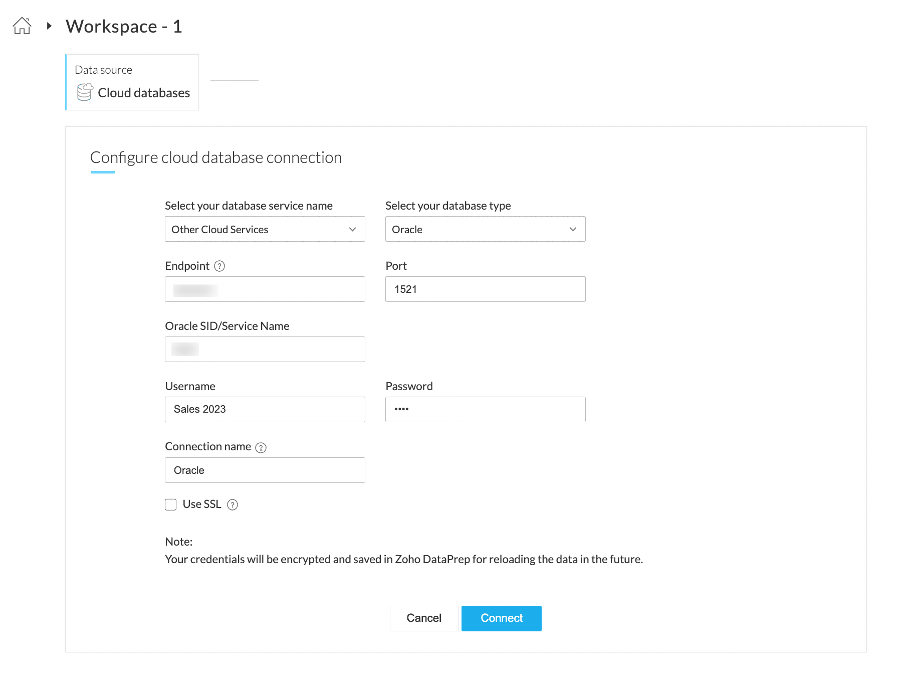 4. 認証情報として、Endpoint、Port、Oracle SID/サービス 名前、ユーザー名、およびパスワードを入力し、データベース接続を認証します。