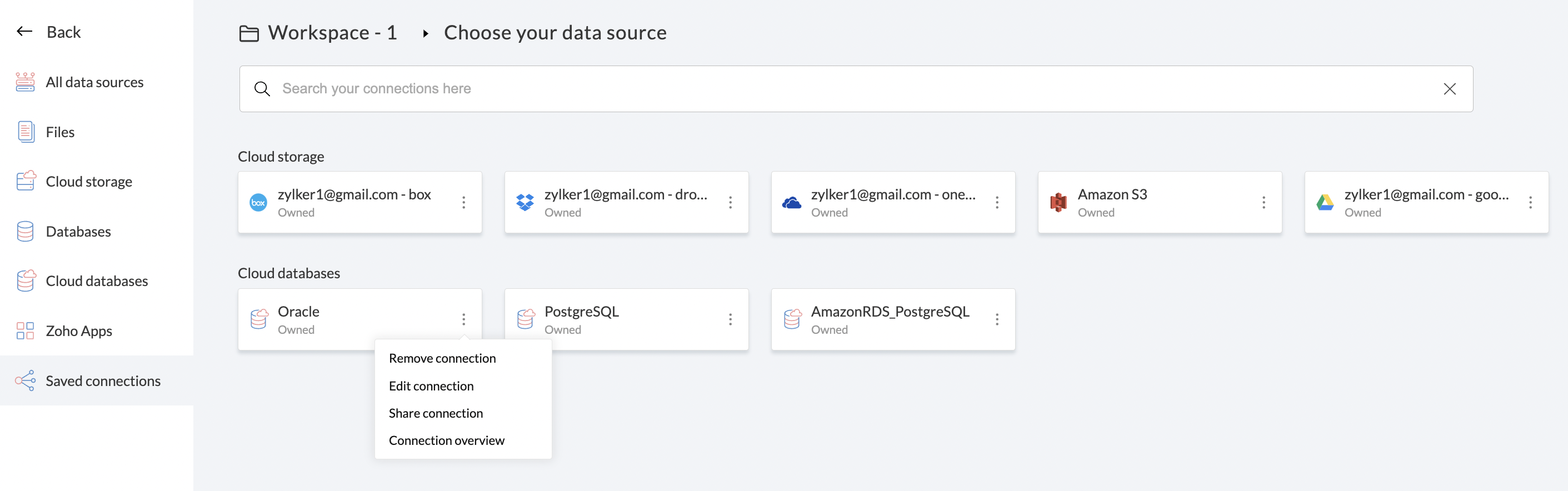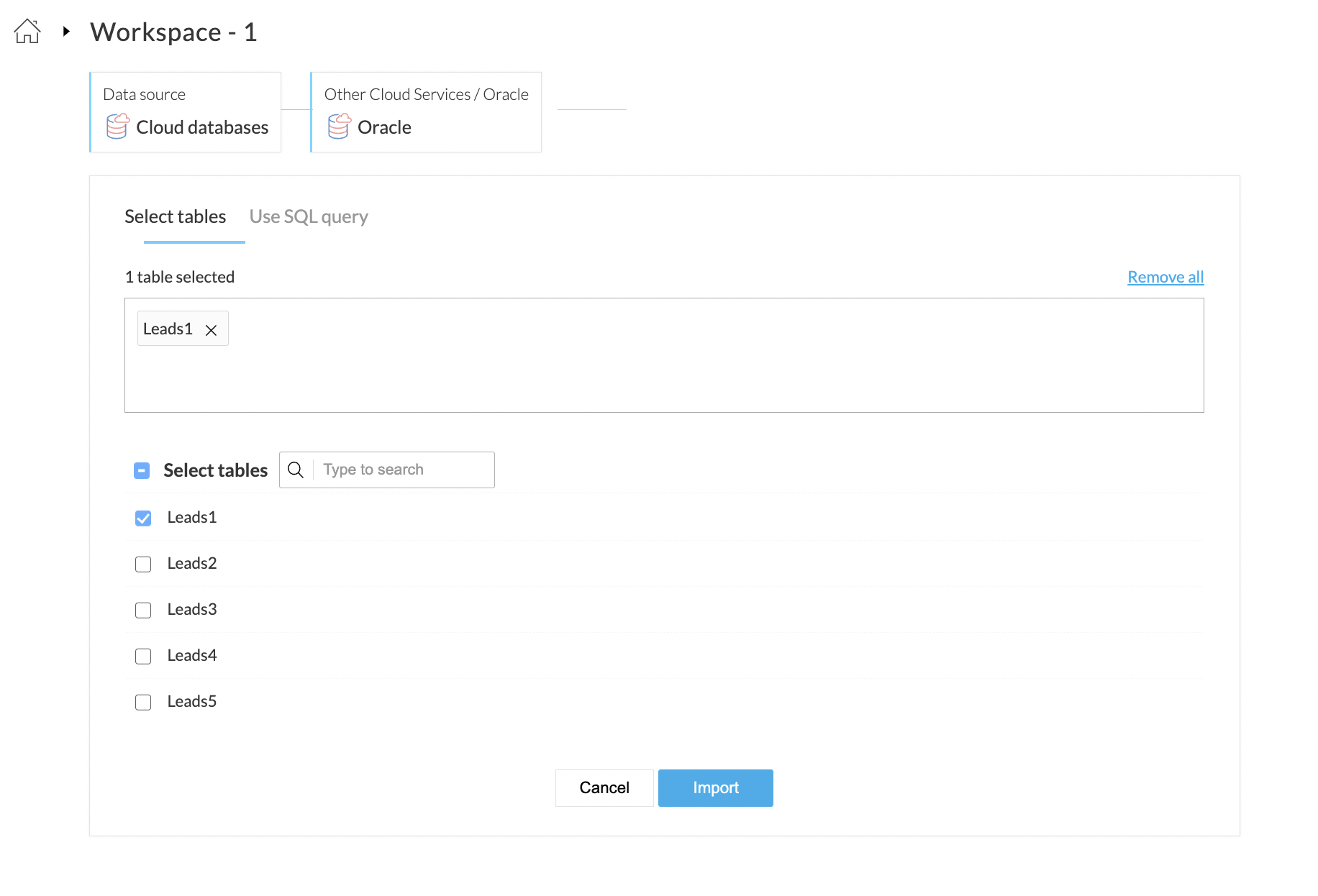 Zoho DataPrep では、Oracle などの他のクラウドサービスからデータをインポートすることができます。Oracle は、オラクル社が開発したリレーショナルデータベース管理システムで、データの保存、整理、検索に利用されています。